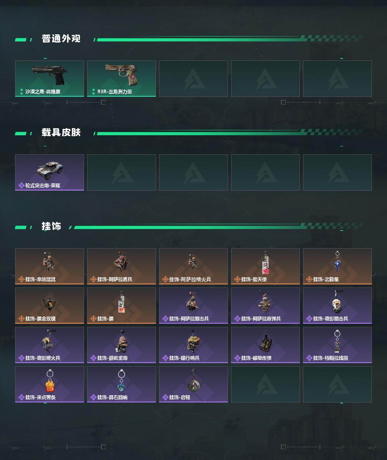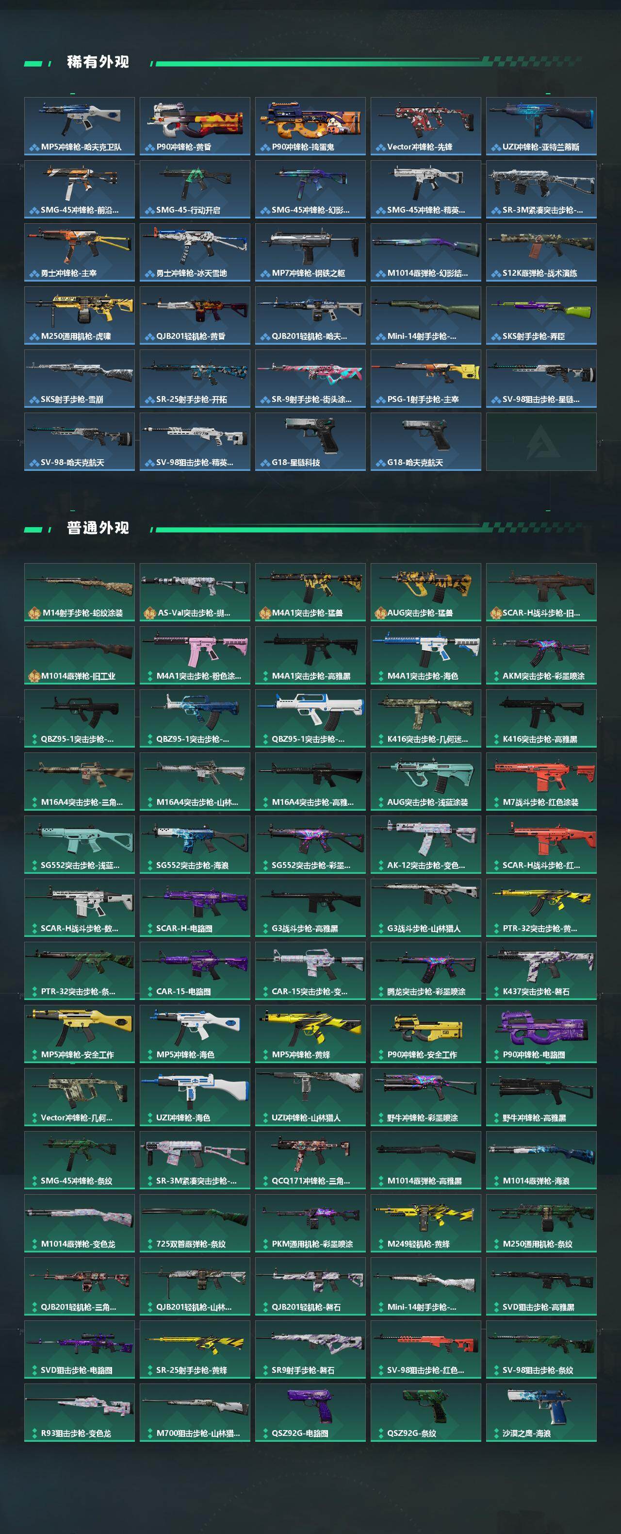 【史诗外观】:QBZ95-1突击步枪-曙光,ASh-12战斗步枪-无极限,M16A4突击步枪-竞赛选手,AUG突击步枪-蝮蛇,M7战斗步枪-百步穿杨,SG552突击步枪-深海恐惧,SCAR-H战斗步枪-囚徒,G3战斗步枪-流沙送葬,AS Val突击步枪-百步穿杨,腾龙突击步枪-无垢,腾龙突击步枪-猎鳄行动,K437突击步枪-守护者,MP5冲锋枪-深海恐惧,MP5冲锋枪-战术竞备,MP5冲锋枪-竞技风,Vector冲锋枪-阿萨拉文明,Vector冲锋枪-猎鳄行动,Vector冲锋枪-百步穿杨,Vector冲锋枪-异域战争,SR-3M紧凑突击步枪-荒野求生,SR-3M紧凑突击步枪-战术竞备,勇士冲锋枪-深海恐惧,勇士冲锋枪-工业狂潮,MP7冲锋枪-无垢,MP7冲锋枪-守护者,S12K霰弹枪-曙光,PKM通用机枪-蝮蛇,PKM通用机枪-荒野求生,M250通用机枪-囚徒,Mini-14射手步枪-守护者,SVD狙击步枪-阿萨拉工艺,SVD狙击步枪-荒野求生,PSG-1射手步枪-无垢,SV-98狙击步枪-林中猎手,SV-98狙击步枪-囚徒,M700狙击步枪-竞技风,M700狙击步枪-蝮蛇,M700狙击步枪-百步穿杨,M700狙击步枪-哈夫克警备,AWM狙击步枪-无极限,AWM狙击步枪-流沙送葬,复合弓-守护者