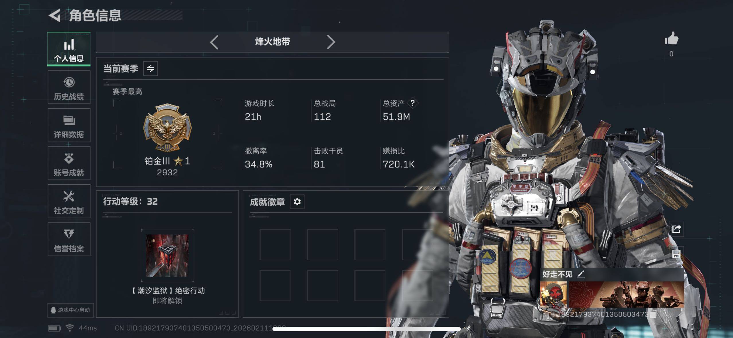 [16695515]【特价出售/店主推荐】51m总资产-7282k哈伏币-32烽火等级-铂金-1战场等级-无军衔