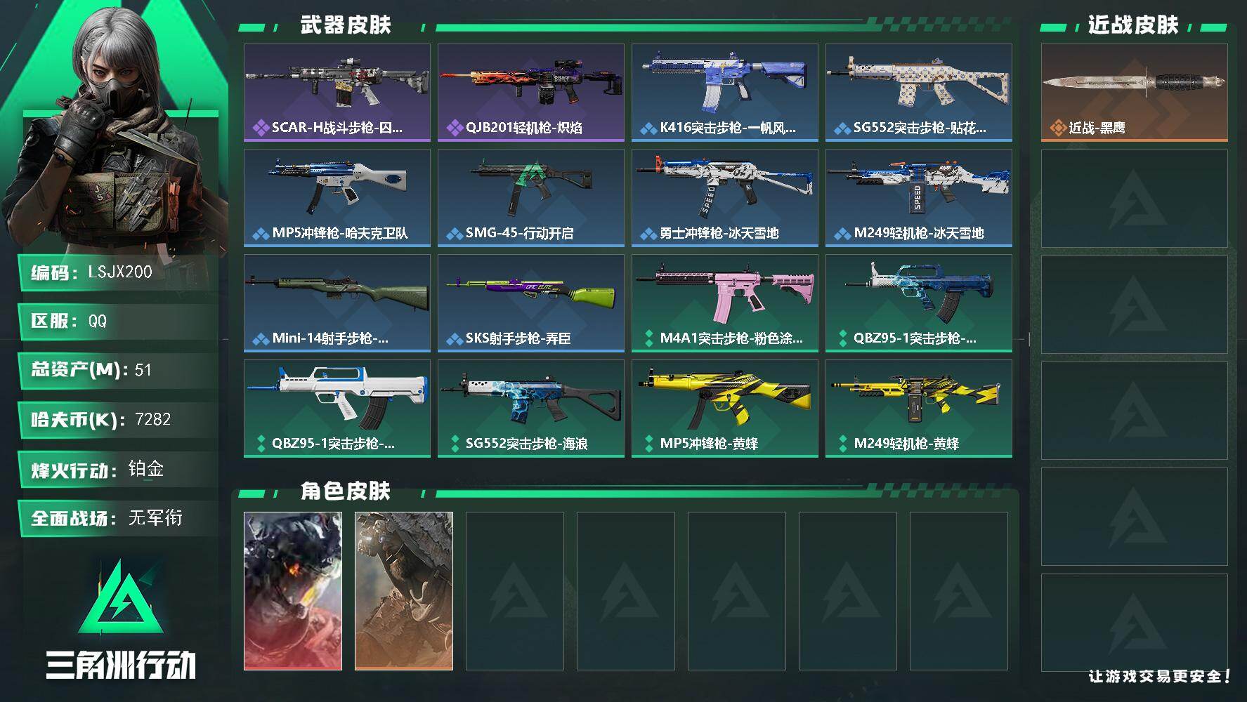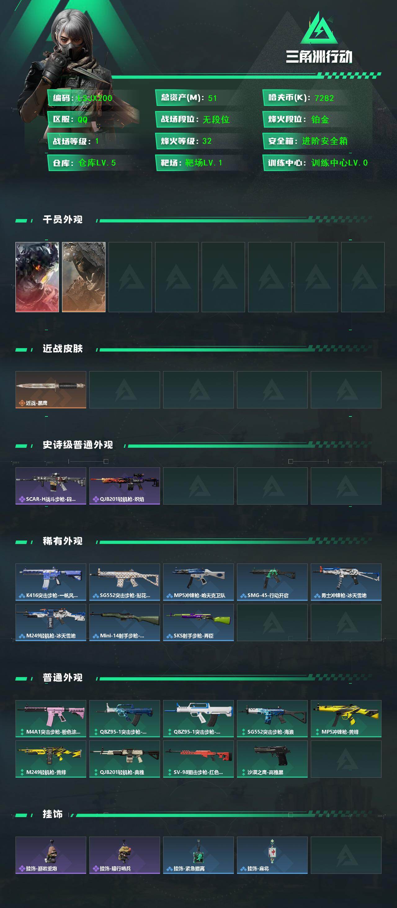 [16695515]【特价出售/店主推荐】51m总资产-7282k哈伏币-32烽火等级-铂金-1战场等级-无军衔 【干员外观】:威龙-凌霄戍卫,乌鲁鲁-荒原猎手 【近战皮肤】:近战-黑鹰 【传说外观】:QBZ95-1突击步枪-凌霄戍卫 【史诗外观】:SCAR-H战斗步枪-囚徒,QJB201轻机枪-炽焰 【稀有外观】:K416突击步枪-一帆风顺,SG552突击步枪-贴花艺术,MP5冲锋枪-哈夫克卫队,SMG-45-行动开启,勇士冲锋枪-冰天雪地,M249轻机枪-冰天雪地,Mini-14射手步枪-荣耀列队,SKS射手步枪-弄臣 【普通外观】:M4A1突击步枪-粉色涂装,QBZ95-1突击步枪-海浪,QBZ95-1突击步枪-海色,SG552突击步枪-海浪,MP5冲锋枪-黄蜂,M249轻机枪-黄蜂,QJB201轻机枪-典雅,SV-98狙击步枪-红色涂装,沙漠之鹰-高雅黑 【挂饰】:挂饰-崩岩重炮,挂饰-暗行哨兵*3,挂饰-紧急撤离*5,挂饰-麻将