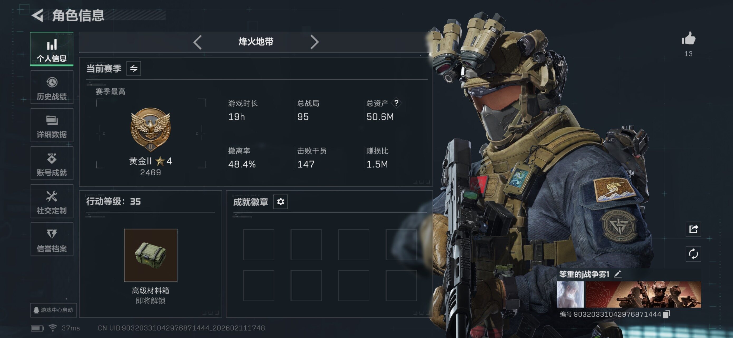 [16695536]【特价出售/店主推荐】50m总资产-6378k哈伏币-35烽火等级-黄金-1战场等级-无军衔