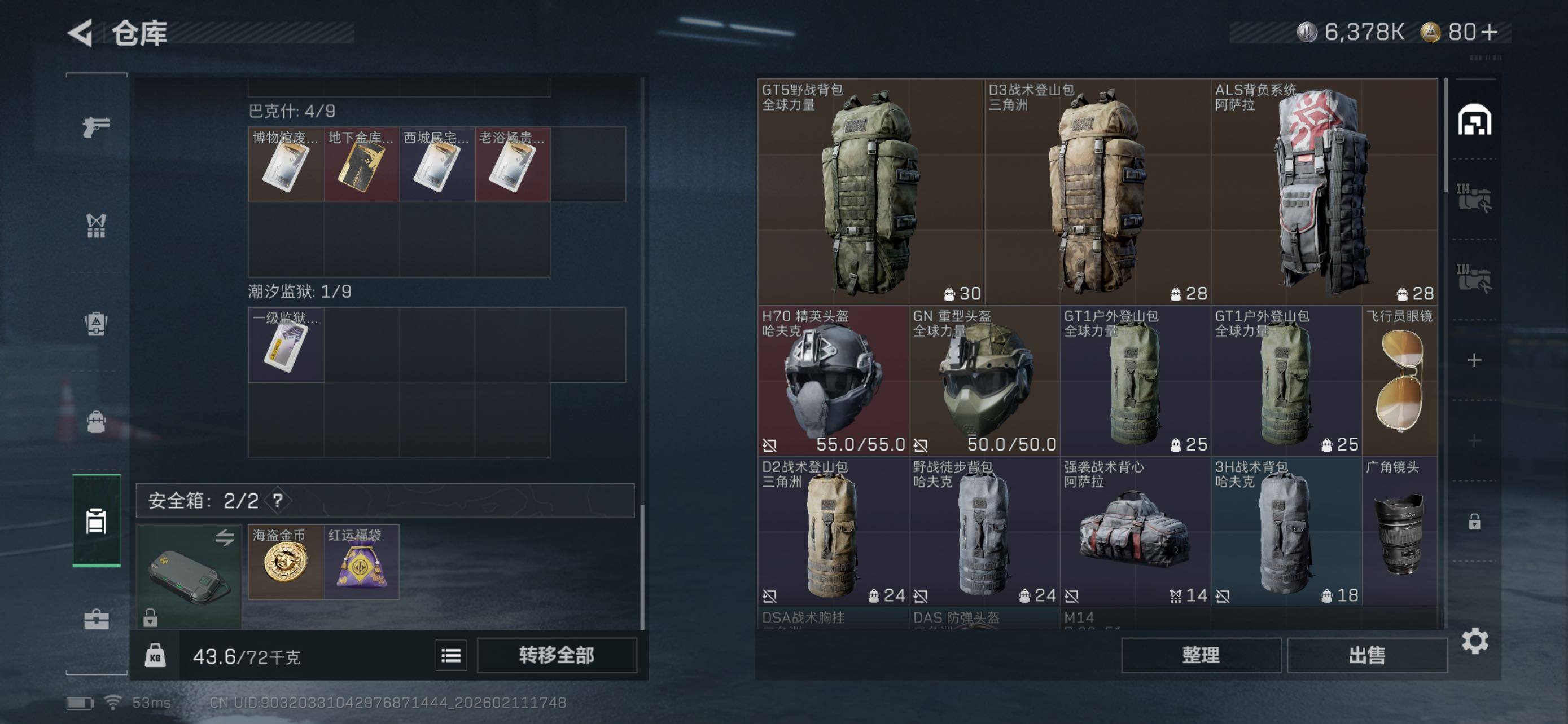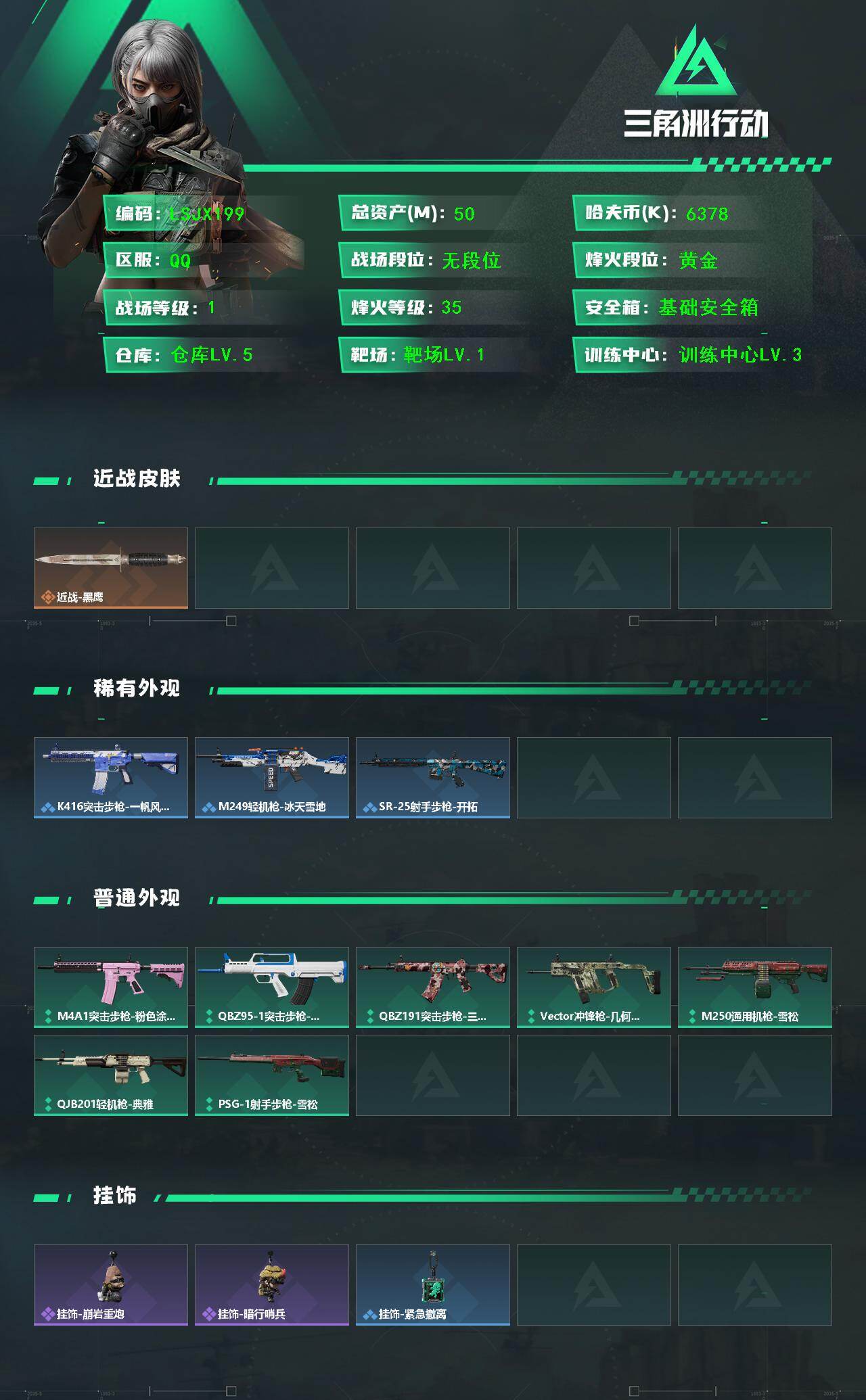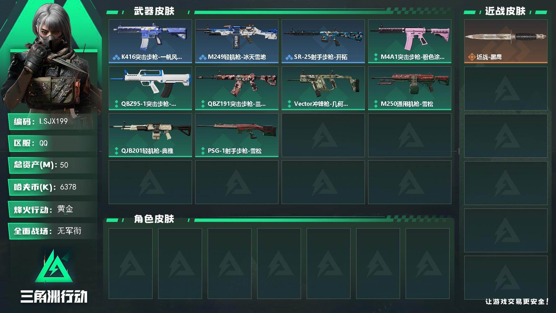 [16695536]【特价出售/店主推荐】50m总资产-6378k哈伏币-35烽火等级-黄金-1战场等级-无军衔 【近战皮肤】:近战-黑鹰 【稀有外观】:K416突击步枪-一帆风顺,M249轻机枪-冰天雪地,SR-25射手步枪-开拓 【普通外观】:M4A1突击步枪-粉色涂装,QBZ95-1突击步枪-海色,QBZ95-1突击步枪-2026,QBZ191突击步枪-三角洲力量,Vector冲锋枪-几何迷彩,M250通用机枪-雪松,QJB201轻机枪-典雅,PSG-1射手步枪-雪松 【挂饰】:挂饰-崩岩重炮*2,挂饰-暗行哨兵*2,挂饰-紧急撤离*2