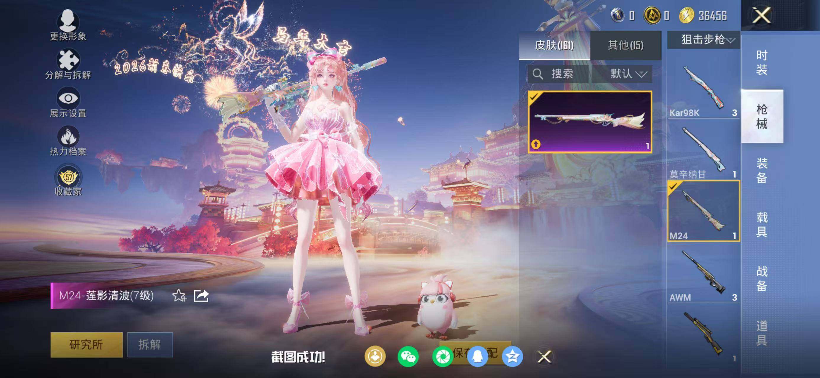 【粉色枪皮】:AKM-绿萝繁花,M416-电玩时刻,Kar98K-巳巳如意,M24-莲影清波,DP-28-豹影疾电