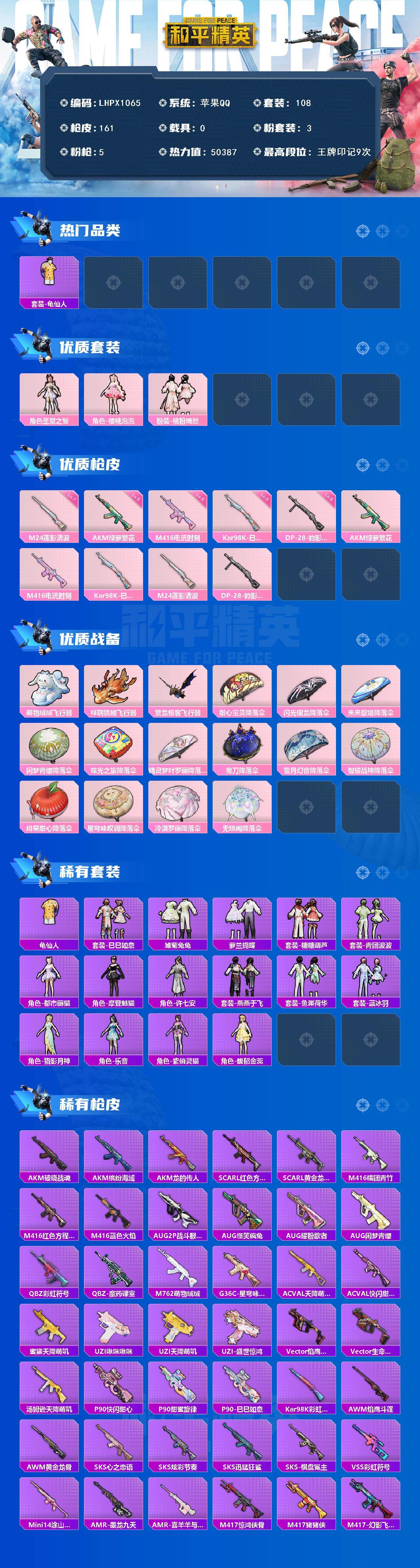 [16695587]有二次【特价出售/店主推荐】苹果 手Q-3粉装-5特效枪-0载具-4粉色飞行器-50387热力值-9王牌印记-108套装-161枪皮 【热门品类】:套装-龟仙人 【粉色套装】:角色-圣堂之誓,角色-樱桃泡泡,粉装-桃粉嫣然 【粉色枪皮等级】:AKM-绿萝繁花(五级),M416-电玩时刻(五级),Kar98K-巳巳如意(五级),M24-莲影清波(七级),DP-28-豹影疾电(五级) 【粉色枪皮】:AKM-绿萝繁花,M416-电玩时刻,Kar98K-巳巳如意,M24-莲影清波,DP-28-豹影疾电 【粉色飞行器】:萌物绒绒飞行器,祥瑞锦鲤飞行器,繁龙极客飞行器 【粉色降落伞】:甜心宝贝降落伞,闪光银龙降落伞,未来歌姬降落伞,闲梦青缨降落伞,炫光之旅降落伞,精灵梦叶罗丽降落伞,鬼刀降落伞,雪月幻音降落伞,智耀战神降落伞,绯果甜心降落伞,星穹咏叹调降落伞,冷漠罗丽降落伞,无垠阁降落伞,炫彩糖果降落伞 【稀有套装】:套装-龟仙人,套装-巳巳如意,套装-雪国风尚,套装-炫彩糖果,套装-雏菊兔兔,套装-萝兰蝴蝶,套装-糖糖葫芦,套装-青团波波,角色-都市丽猫,角色-摩登魅猫,角色-许七安,套装-燕燕于飞,套装-鱼渊荷华,套装-蓝冰羽,角色-猎影月神,角色-乐音,角色-紫俏灵猫,角色-馥郁金蕊 【稀有枪皮】:AKM-破晓战魂,AKM-缤纷海域,AKM-龙的传人,SCAR-L-红色方程式,SCAR-L-黄金龙骨,M416-糯团青竹,M416-红色方程式,M416-蓝色火焰,AUG-2P战斗服款,AUG-怪笑疯兔,AUG-耀粉歌者,AUG-闲梦青缨,QBZ-彩虹符号,QBZ-魔药课室,M762-萌物绒绒,G36C-星穹咏叹调,AC-VAL-天降萌叽,AC-VAL-快闪甜心,蜜獾-天降萌叽,UZI-啾咪啾咪,UZI-天降萌叽,UZI-盛世惊鸿,Vector-焰鹰斗篷,Vector-生命誓言,汤姆逊-天降萌叽,P90-快闪甜心,P90-甜蜜旋律,P90-巳巳如意,Kar98K-彩虹符号,AWM-焰鹰斗篷,AWM-黄金龙骨,SKS-心之恋语,SKS-炫彩节奏,SKS-迅猛狂鲨,SKS-棋盘冕主,VSS-彩虹符号,Mini14-涂山之恋,AMR-喜羊羊与灰太狼,AMR-墨龙九天,M417-惊鸿侠骨,M417-猪猪侠,M417-幻影飞狐,MK20-H-快闪甜心,MK20-H-樱桃泡泡,M200