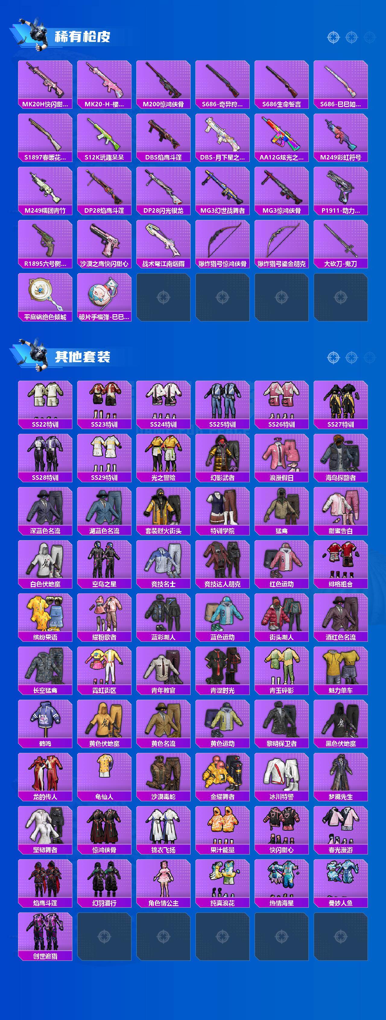 【稀有枪皮】:AKM-破晓战魂,AKM-缤纷海域,AKM-龙的传人,SCAR-L-红色方程式,SCAR-L-黄金龙骨,M416-糯团青竹,M416-红色方程式,M416-蓝色火焰,AUG-2P战斗服款,AUG-怪笑疯兔,AUG-耀粉歌者,AUG-闲梦青缨,QBZ-彩虹符号,QBZ-魔药课室,M762-萌物绒绒,G36C-星穹咏叹调,AC-VAL-天降萌叽,AC-VAL-快闪甜心,蜜獾-天降萌叽,UZI-啾咪啾咪,UZI-天降萌叽,UZI-盛世惊鸿,Vector-焰鹰斗篷,Vector-生命誓言,汤姆逊-天降萌叽,P90-快闪甜心,P90-甜蜜旋律,P90-巳巳如意,Kar98K-彩虹符号,AWM-焰鹰斗篷,AWM-黄金龙骨,SKS-心之恋语,SKS-炫彩节奏,SKS-迅猛狂鲨,SKS-棋盘冕主,VSS-彩虹符号,Mini14-涂山之恋,AMR-喜羊羊与灰太狼,AMR-墨龙九天,M417-惊鸿侠骨,M417-猪猪侠,M417-幻影飞狐,MK20-H-快闪甜心,MK20-H-樱桃泡泡,M200