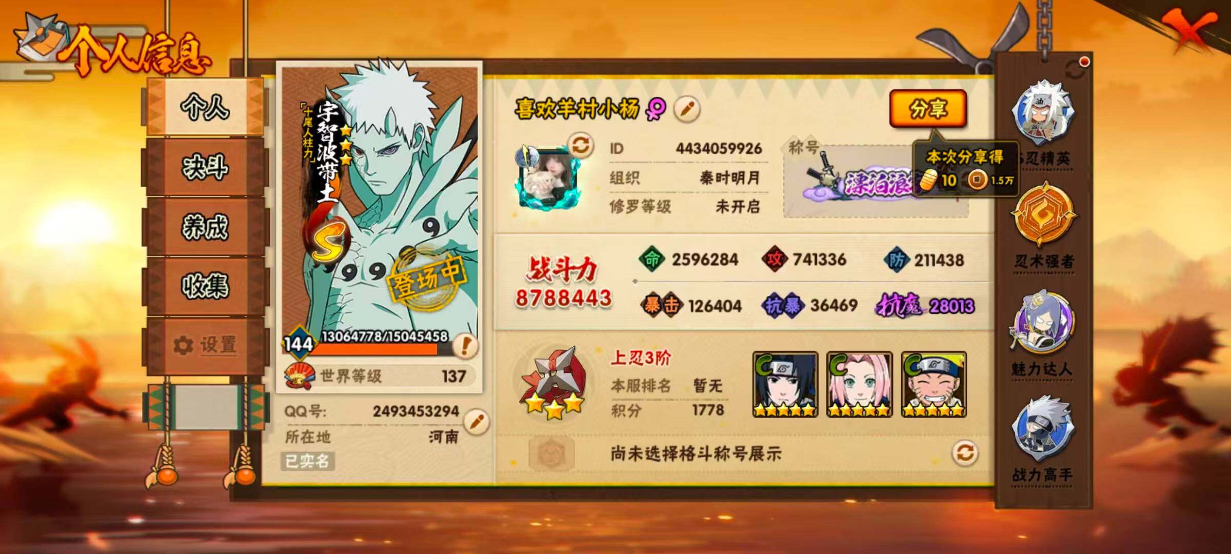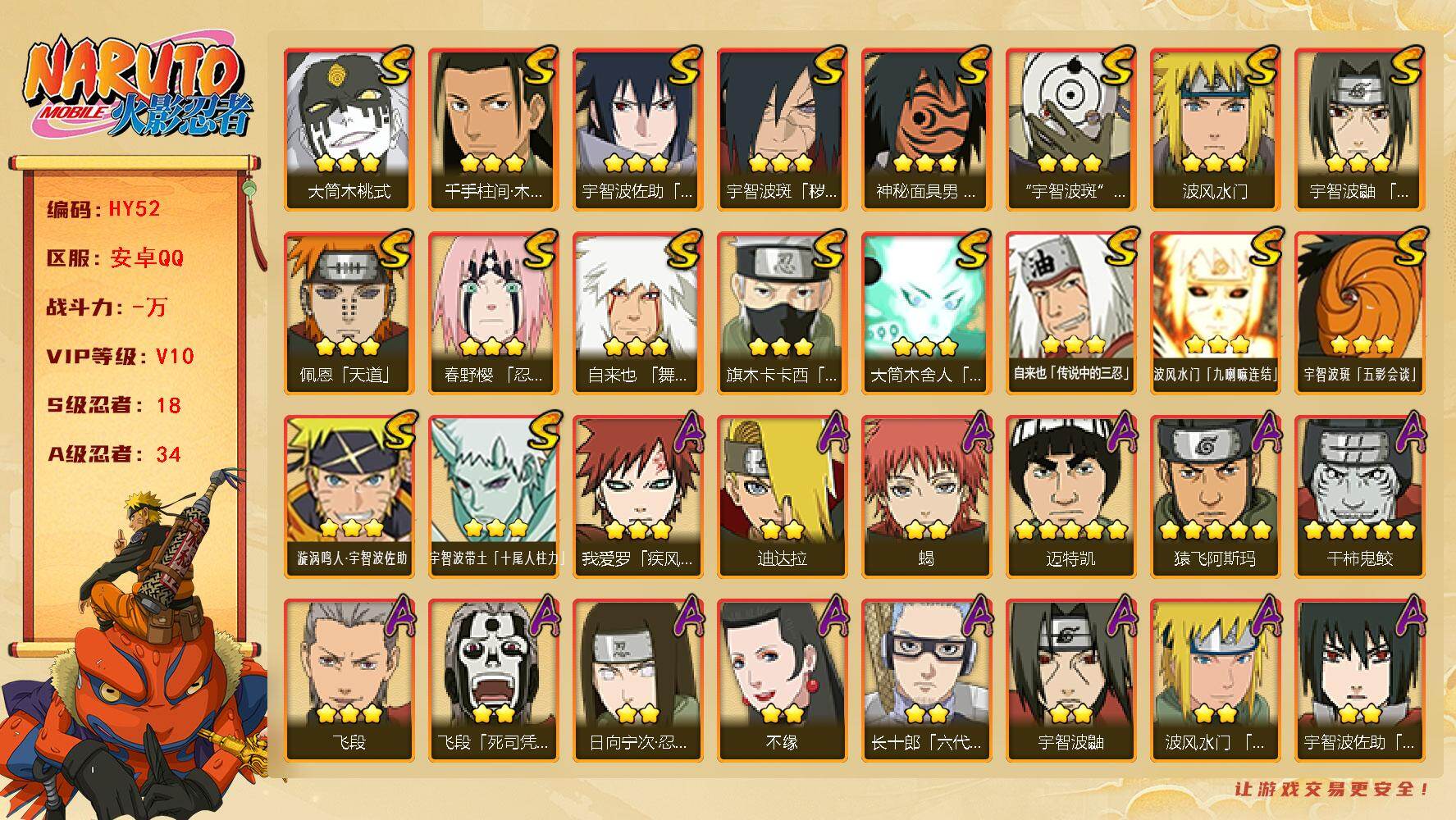 [16695613]VIP10,880W战力,18s,34a,九喇嘛鸣人53片,须佐止水97片,带土已出。多点券a