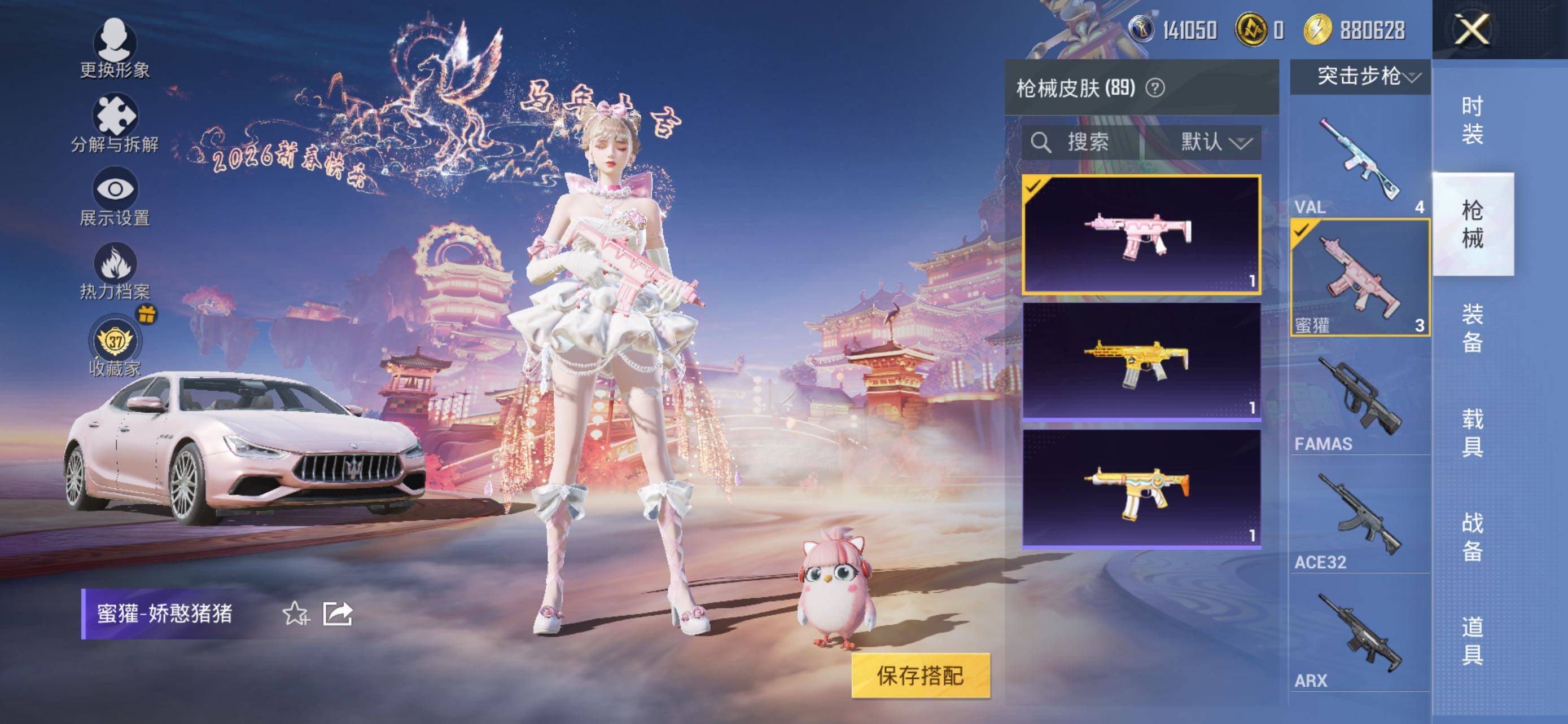 【稀有枪皮】:AKM-彩虹符号,AKM-破晓战魂,AKM-虎虎生威,M16A4-幻世战舞者,M16A4-甜心亚梦,SCAR-L-玉兔迎春,SCAR-L-红色方程式,M416-夜灯,M416-糯团青竹,M416-红色方程式,M416-蓝色火焰,GROZA-田园牧歌,AUG-耀粉歌者,QBZ-飞驰魅影,M762-天星战神,M762-天降萌叽,M762-彩虹甜喵,M762-橘柚倾心,AC-VAL-天降萌叽,AC-VAL-彩虹甜喵,AC-VAL-甜心亚梦,蜜獾-垂柳戏鸭,蜜獾-天降萌叽,蜜獾-娇憨猪猪,UZI-娇憨猪猪,UMP45-夜灯,UMP45-涂山之恋,UMP45-生命誓言,UMP45-蓝色火焰,Vector-彩虹符号,Vector-生命誓言,Vector-田园牧歌,汤姆逊-炫彩节奏,P90-飞驰魅影,P90-巳巳如意,Kar98K-炫彩节奏,Kar98K-红色方程式,Kar98K-飞驰魅影,M24-炫彩节奏,VSS-彩虹符号,VSS-田园牧歌,Mini14-炫彩节奏,SLR-娇憨猪猪,S686-橘柚倾心,S686-生命誓言,S1897-炫彩节奏,S1897-飞驰魅影,S12K-玩趣呆呆,S12K-娇憨猪猪,S12K-幻世战舞者,DBS-彩虹甜喵,DBS-甜心亚梦,DBS-第五大道,SPAS-12-田园牧歌,M249-破晓战魂,M249-糯团青竹,DP-28-橘柚倾心,DP-28-甜心亚梦,MG3-幻世战舞者,MG3-第五大道