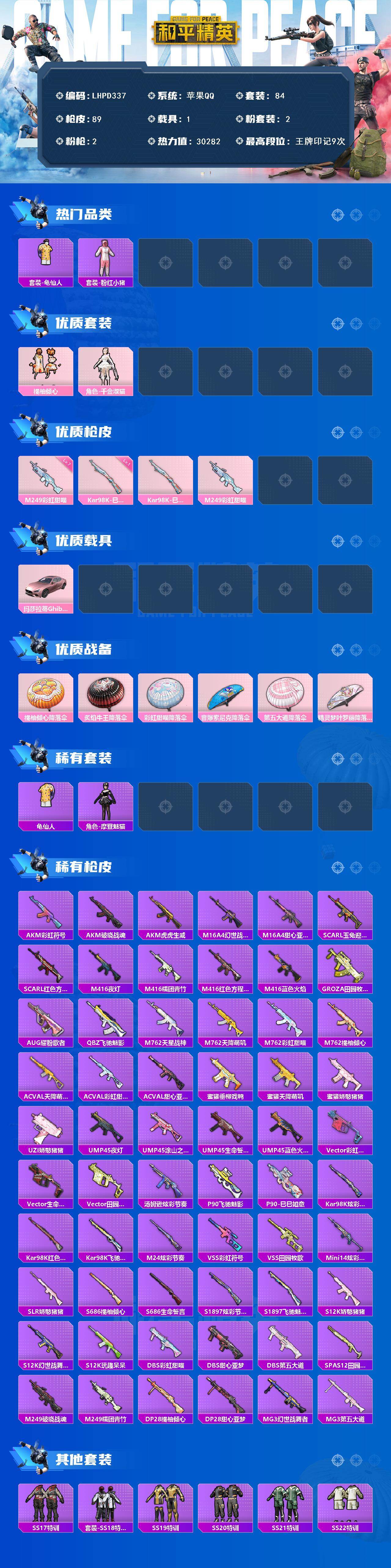 [16696181]【特价出售/店主推荐】苹果 手Q-2粉装-2特效枪-1载具--3w热力值-9王牌印记-84套装-89枪皮 【热门品类】:套装-龟仙人,套装-粉红小猪 【粉色套装】:粉装-橘柚倾心,角色-千金淑猫 【粉色枪皮等级】:Kar98K-巳巳如意(一级),M249-彩虹甜喵(七级) 【粉色载具】:玛莎拉蒂Ghibli(粉) 【粉色枪皮】:Kar98K-巳巳如意,M249-彩虹甜喵 【粉色降落伞】:橘柚倾心降落伞,炙焰牛王降落伞,彩虹甜喵降落伞,音爆索尼克降落伞,第五大道降落伞,精灵梦叶罗丽降落伞 【稀有套装】:套装-龟仙人,角色-摩登魅猫 【稀有枪皮】:AKM-彩虹符号,AKM-破晓战魂,AKM-虎虎生威,M16A4-幻世战舞者,M16A4-甜心亚梦,SCAR-L-玉兔迎春,SCAR-L-红色方程式,M416-夜灯,M416-糯团青竹,M416-红色方程式,M416-蓝色火焰,GROZA-田园牧歌,AUG-耀粉歌者,QBZ-飞驰魅影,M762-天星战神,M762-天降萌叽,M762-彩虹甜喵,M762-橘柚倾心,AC-VAL-天降萌叽,AC-VAL-彩虹甜喵,AC-VAL-甜心亚梦,蜜獾-垂柳戏鸭,蜜獾-天降萌叽,蜜獾-娇憨猪猪,UZI-娇憨猪猪,UMP45-夜灯,UMP45-涂山之恋,UMP45-生命誓言,UMP45-蓝色火焰,Vector-彩虹符号,Vector-生命誓言,Vector-田园牧歌,汤姆逊-炫彩节奏,P90-飞驰魅影,P90-巳巳如意,Kar98K-炫彩节奏,Kar98K-红色方程式,Kar98K-飞驰魅影,M24-炫彩节奏,VSS-彩虹符号,VSS-田园牧歌,Mini14-炫彩节奏,SLR-娇憨猪猪,S686-橘柚倾心,S686-生命誓言,S1897-炫彩节奏,S1897-飞驰魅影,S12K-玩趣呆呆,S12K-娇憨猪猪,S12K-幻世战舞者,DBS-彩虹甜喵,DBS-甜心亚梦,DBS-第五大道,SPAS-12-田园牧歌,M249-破晓战魂,M249-糯团青竹,DP-28-橘柚倾心,DP-28-甜心亚梦,MG3-幻世战舞者,MG3-第五大道 【其他套装】:套装-SS17特训,套装-SS18特训,套装-SS19特训,套装-SS20特训,套装-SS21特训,套装-SS22特训,套装-SS23特训,套装-SS24特训,套装-SS25特训,套装-SS27特训,套
