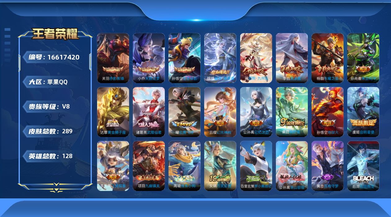[16617420]苹果Q-V8-至尊星耀II段位-128英雄-284皮肤-3典藏皮肤-1珍品传说-14传说-88史诗 【荣耀典藏】:孙悟空全息碎影,小乔天鹅之梦,关羽赤影疾锋 【珍品传说】:嫦娥器灵落星盏 【传说皮肤】:后羿神树通天,澜愿照九州拓,云缨幻光神枪,桑启鸣野蒿,公孙离记忆之芯,李元芳飞鸢探春,虞姬启明星使,曜云鹰飞将,达摩黄金狮子座,杨戬永曜之星,诸葛亮武陵仙君,李白凤求凰,孙尚香末日机甲,孙悟空地狱火 【限定皮肤】:白起狰,蒙犽顽岩魄,姜子牙天穹之誓,狄仁杰阴阳师,虞姬凯尔特女王,赵云皇家上将,嬴政白昼王子,庄周高山流水,高渐离死亡摇滚,高渐离玩趣恶龙,孙膑妖精王,扁鹊炼金王,芈月重明,吕布猎兽之王,周瑜赤莲之焰,夏侯惇朔风刀,曹操烛龙,典韦穷奇,马可波罗逐梦之星,狄仁杰魔术师,狄仁杰万华元夜,达摩沙漠行僧,项羽海滩派对,老夫子醍醐杖,关羽冰锋战神,兰陵王驯魔猎人,兰陵王金庭之子,孙悟空至尊宝,孙悟空大圣娶亲,牛魔御旌,后羿如梦令,李元芳云中旅人,虞姬启明星使,钟馗驱傩正仪,杨玉环遇见飞天,杨戬永曜之星,雅典娜黎明之约,蔡文姬繁星吟游,太乙真人饕餮,鬼谷子原初探秘者,鬼谷子五谷丰年,诸葛亮武陵仙君,铠青龙志,苏烈千军破阵,百里玄策原初追逐者,弈星混沌棋,梦奇顽趣,沈梦溪大漠名商,明世隐疑决卦,裴擒虎李小龙,裴擒虎擒涛扼浪,狂铁御狮,米莱狄御霄,云中君纤云弄巧,盾山御銮,猪八戒西部大镖客,上官婉儿梁祝,上官婉儿天狼绘梦者,桑启海盐诗旅,阿古朵江河有灵,张良古海寻踪,蒙恬荣光圣徽,鬼谷子天穹祈灯,姬小满妄想食味,沈梦溪龙舞盛年,刘邦剑破天穹,程咬金群星魔术团,周瑜熔金海岸 【年限皮肤】:李白凤求凰,杨戬永曜之星,铠青龙志,澜愿照九州拓 【赛季限定】:孙膑妖精王,扁鹊炼金王,虞姬凯尔特女王,白起狰,太乙真人饕餮,曹操烛龙,芈月重明,典韦穷奇,狂铁御狮,米莱狄御霄,牛魔御旌,盾山御銮,夏侯惇朔风刀,弈星混沌棋,明世隐疑决卦,老夫子醍醐杖,鬼谷子原初探秘者,狄仁杰万华元夜,钟馗驱傩正仪,苏烈千军破阵,达摩沙漠行僧,兰陵王金庭之子,沈梦溪大漠名商,李元芳云中旅人,桑启海盐诗旅,裴擒虎擒涛扼浪,张良古海寻踪,鬼谷子天穹祈灯,刘邦剑破天穹,姜子牙天穹之誓,东皇太一噬灭天穹,太乙真人谧流熔炉,甄姬逆浪荇歌,亚瑟荣光之誓,百里玄策原初追逐者,雅典娜黎明之约,梦奇顽趣,蒙恬荣光圣徽,牛魔星