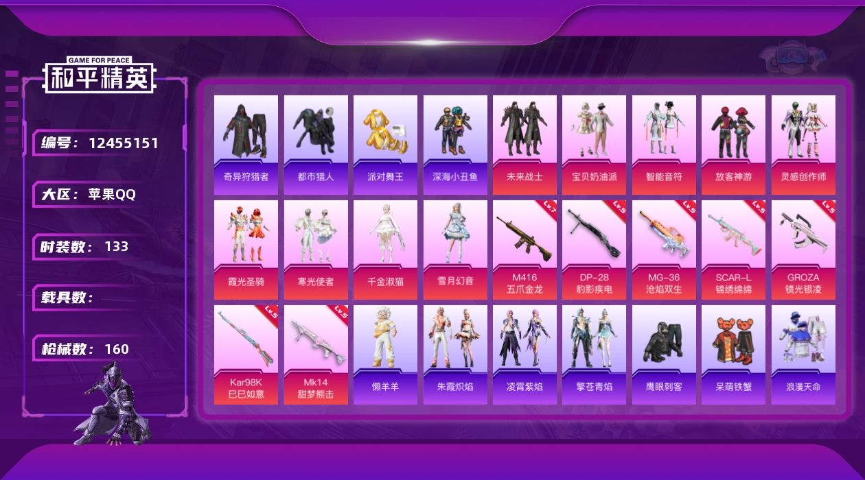 [12455151]【817】苹果 手Q-9粉装-7特效枪-0载具-3粉色飞行器-53958热力值-10王牌印记-133套装-160枪皮