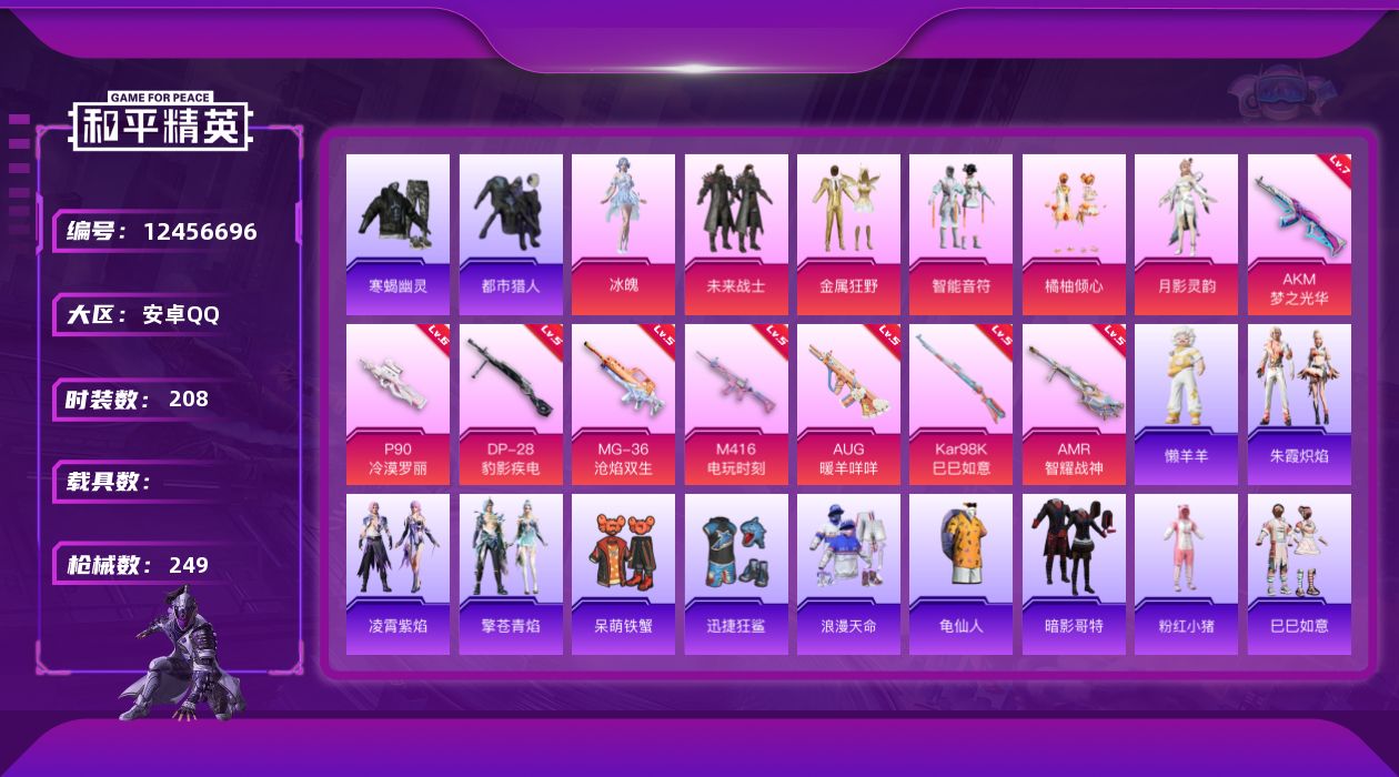[12456696]【822】安卓 手Q-6粉装-8特效枪-0载具-0粉色飞行器-74883热力值-11王牌印记-208套装-249枪皮
