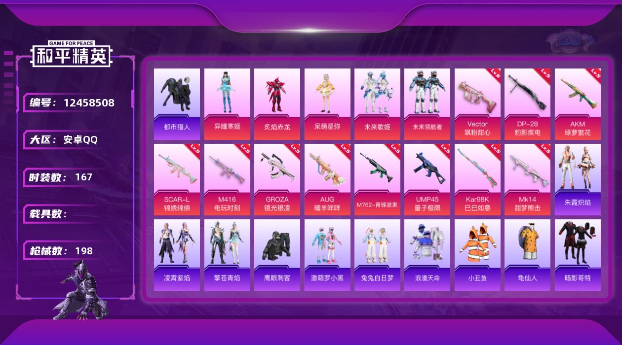 [12458508]【826】安卓 手Q-5粉装-11特效枪-0载具-0粉色飞行器-58586热力值-14王牌印记-167套装-198枪皮