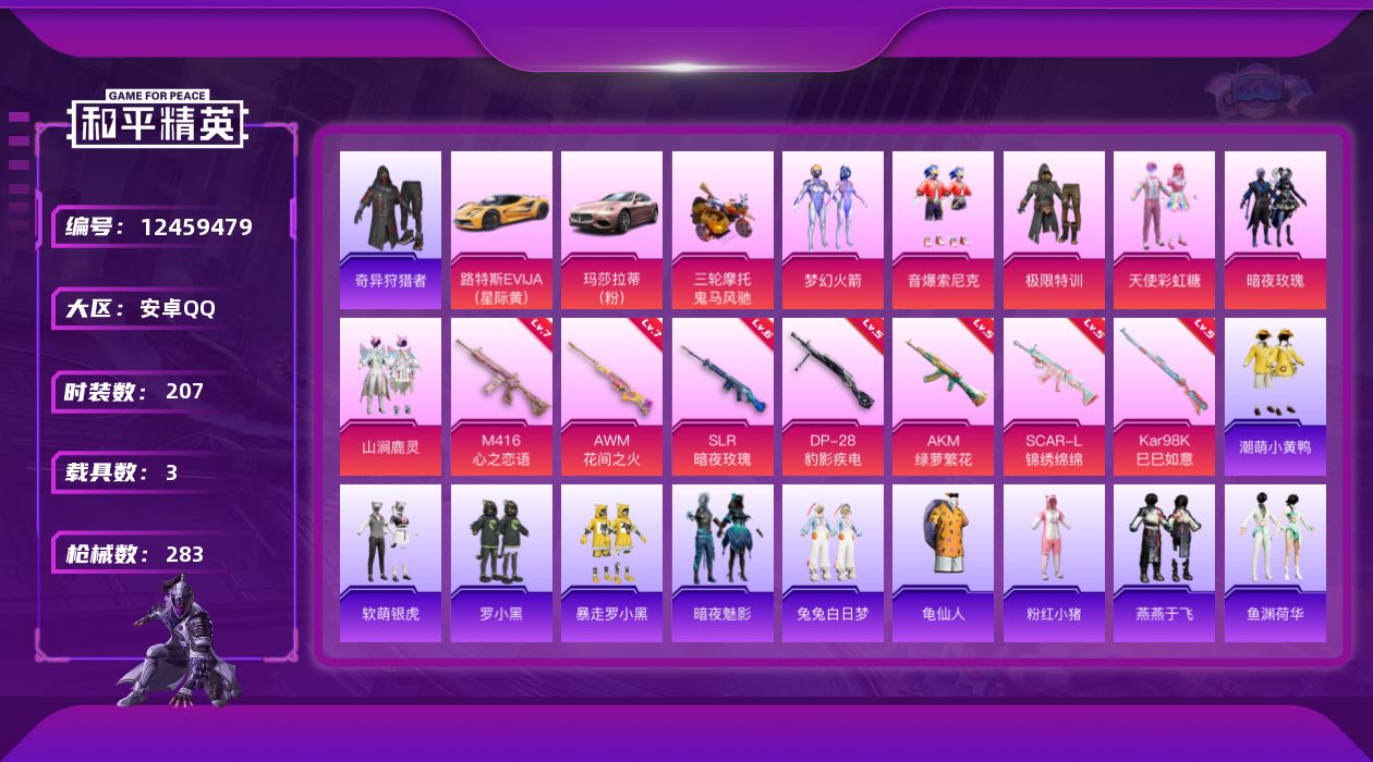 [12459479]【831】安卓 手Q-6粉装-7特效枪-3载具-3粉色飞行器-90763热力值-11王牌印记-207套装-283枪皮 【热门品类】:粉装-梦幻火箭,粉装-音爆索尼克,绝对防御上衣,套装-奇异狩猎者,套装-龟仙人,套装-潮萌小黄鸭,套装-粉红小猪 【粉色载具】:路特斯EVIJA(星际黄),玛莎拉蒂Ghibli(粉),鬼马风驰 【粉色套装】:粉装-极限特训,粉装-天使彩虹糖,粉装-梦幻火箭,粉装-暗夜玫瑰,粉装-山涧鹿灵,粉装-音爆索尼克 【粉色枪皮等级】:AKM-绿萝繁花(五级),SCAR-L-锦绣绵绵(五级),M416-心之恋语(七级),Kar98K-巳巳如意(五级),AWM-花间之火(七级),SLR-暗夜玫瑰(六级),DP-28-豹影疾电(五级) 【粉色枪皮】:AKM-绿萝繁花,SCAR-L-锦绣绵绵,M416-心之恋语,Kar98K-巳巳如意,AWM-花间之火,SLR-暗夜玫瑰,DP-28-豹影疾电 【粉色飞行器】:梦幻火箭飞行器,齐天大圣飞行器,庄周梦蝶飞行器 【粉色降落伞】:极限特训降落伞,百万伏特降落伞,梦幻火箭降落伞,PEL轰鸣竞梦者降落伞,古堡领主降落伞,花间之火降落伞,潮汐统领降落伞,激战未来降落伞,银刃赛罗降落伞,暗夜玫瑰降落伞,洛神天依降落伞,筑梦精灵降落伞,旋转彩虹降落伞,第五大道降落伞,莲影清波降落伞,江南烟雨降落伞 【稀有套装】:套装-龟仙人,套装-燕燕于飞,套装-鱼渊荷华,角色-时希公主 【稀有枪皮】:AKM-夜灯,AKM-彩虹符号,AKM-星之彼岸,AKM-灼热熔岩,AKM-玉龙,AKM-生命誓言,AKM-破晓战魂,AKM-萌趣颜团子,AKM-虎虎生威,AKM-霓虹街区,M16A4-幻世战舞者,M16A4-机械英豪,M16A4-甜心亚梦,M16A4-红色方程式,M16A4-莲影清波,SCAR-L-暗夜玫瑰,SCAR-L-炫彩节奏,SCAR-L-玉兔迎春,SCAR-L-红色方程式,M416-仓鼠灰灰,M416-夜灯,M416-糯团青竹,M416-红色方程式,M416-绯红前夜,M416-蓝色火焰,GROZA-异彩先驱,GROZA-彩虹符号,GROZA-懵萌河马,GROZA-治愈之星,GROZA-生命誓言,GROZA-田园牧歌,GROZA-蓝莓炮弹,GROZA-黑色刀锋,AUG-天降萌叽,AUG-幻影战神,AUG-耀粉歌者,AUG-青春冒