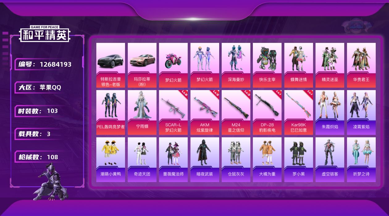 - [16138750]【特价出售/店主推荐】苹果 手Q-1神装-20粉装-10特效枪-1僚机-8载具-5粉色飞行器-70277热力值-5王牌印记-118套装-153枪皮 【红色载具】:路特斯ELETRE(电光紫)(一级) 【红色神装等级】:墨龙九天-敖渊(一级) 【红色角色神装】:墨龙九天-敖渊 【热门品类】:粉装-梦幻火箭,粉装-童趣迷兔,套装-冥河战士,套装-小丑鱼,套装-奇异狩猎者,角色-军刀雅典娜,套装-龟仙人,套装-暗影哥特,套装-粉红小猪 【粉色套装】:粉装-梦幻火箭,粉装-星之信仰,粉装-天禅智恒,粉装-彗云及圣,粉装-绚金战神,粉装-冰霜白皇,粉装-童趣迷兔,粉装-炙焰红王,粉装-飓风飞鹰,粉装-齐天大圣,粉装-碧影闪光,粉装-赤焰黑爵,粉装-紫电风暴,粉装-筑梦精灵,粉装-霓裳武神,粉装-千面幻镜,粉装-暗夜鎏金,粉装-海螺星光,角色-美雪,角色-电磁星 【粉色枪皮等级】:AKM-百合蜜语(七级),SCAR-L-纯梦嫁纱(二级),M416-五爪金龙(二级),M416-风花雪月(七级),M416-墨龙九天(二级),M762-冷魅冰骑(三级),UZI-绮梦青鸾(三级),UMP45-恐龙拽拽(二级),Kar98K-巳巳如意(一级),MG3-洛神天依(三级) 【粉色载具】:兰博基尼Estoque(银翼灰),路特斯ELETRE(电光紫),迈凯伦570S(天际蓝),星河领航(磐石银),合金龙骨(绿),焰龙咆哮,双人摩托-双刃魅影(红),僚机-萌兔起飞,星梦玉骢 【粉色枪皮】:AKM-百合蜜语,SCAR-L-纯梦嫁纱,M416-五爪金龙,M416-风花雪月,M416-墨龙九天,M762-冷魅冰骑,UZI-绮梦青鸾,UMP45-恐龙拽拽,Kar98K-巳巳如意,MG3-洛神天依 【粉色飞行器】:青春物语飞行器,千面幻镜飞行器,镜域双华-灵镜之阶,龙翔九天飞行器 【粉色降落伞】:梦幻火箭降落伞,童趣迷兔降落伞,古战神甲降落伞,葫芦兄弟降落伞,洛神天依降落伞,暗星紫秘降落伞,碧影闪光降落伞,恐龙拽拽降落伞,冷魅冰骑降落伞,炙焰牛王降落伞,环太平洋降落伞,垂柳戏鸭降落伞,彩虹甜喵降落伞,千面幻镜降落伞,海螺星光降落伞,音爆索尼克降落伞,未来歌姬降落伞,墨龙九天降落伞,炫彩糖果降落伞 【稀有套装】:套装-龟仙人,套装-雏菊兔兔,套装-萝兰蝴蝶,角色-狂花道·娜可露露 【稀有枪皮】:AKM-奇