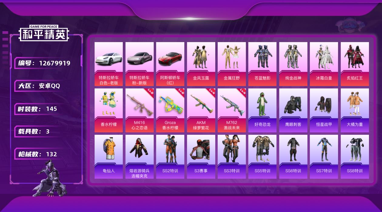 [12679919]【1116】安卓 手Q-7粉装-4特效枪-3载具-2粉色飞行器-51510热力值-3王牌印记-145套装-132枪皮 【热门品类】:套装-SS1特训,套装-龟仙人,熔岩游骑兵面罩,熔岩游骑兵连帽夹克 【粉色载具】:特斯拉Model 3(珍珠白),特斯拉Roadster(沁心粉),阿斯顿马丁DBS(红) 【粉色套装】:粉装-金风玉露,粉装-金属狂野,粉装-苍蓝魅影,粉装-绚金战神,粉装-冰霜白皇,粉装-炙焰红王,粉装-香水柠檬 【粉色枪皮等级】:AKM-绿萝繁花(四级),M416-心之恋语(六级),GROZA-香水柠檬(六级),M762-激战未来(四级) 【粉色枪皮】:AKM-绿萝繁花,M416-心之恋语,GROZA-香水柠檬,M762-激战未来 【粉色飞行器】:炫紫旋律飞行器,激战未来飞行器 【粉色降落伞】:深海曼妙降落伞,凝视深渊降落伞,银河战甲降落伞,至尊龙雀降落伞,PEL轰鸣竞梦者降落伞,激战未来降落伞,银刃赛罗降落伞,香水柠檬降落伞,圣堂之誓降落伞 【稀有套装】:套装-龟仙人 【稀有枪皮】:AKM-PEL轰鸣竞梦者,AKM-冰凉西瓜,AKM-四圣焕新,AKM-夜灯,AKM-彩虹符号,AKM-霓虹街区,M16A4-凝视深渊,M16A4-生命誓言,SCAR-L-炫彩节奏,SCAR-L-玉兔迎春,SCAR-L-甜蜜誓约,SCAR-L-红色方程式,SCAR-L-金风玉露,SCAR-L-黄金龙骨,M416-糯团青竹,M416-红色方程式,M416-绯红前夜,M416-蓝色火焰,GROZA-彩虹符号,GROZA-治愈之星,GROZA-生命誓言,AUG-天降萌叽,QBZ-原初圣火,QBZ-彩虹符号,QBZ-未来歌姬,M762-天降萌叽,M762-深海曼妙,M762-牛气冲天,G36C-荒野猎神,AC-VAL-天降萌叽,AC-VAL-快闪甜心,UZI-啾咪啾咪,UZI-生命誓言,UZI-赤寒幽灵,UMP45-快乐主宰,UMP45-电音之王,Vector-彩虹符号,Vector-治愈之星,Vector-香水柠檬,汤姆逊-勇闯险境,汤姆逊-银刃赛罗,野牛-夜灯,MP5K-怪笑疯兔,P90-快闪甜心,Kar98K-勇闯险境,Kar98K-彩虹符号,Kar98K-炫彩节奏,Kar98K-红色方程式,M24-治愈之星,M24-香水柠檬,M24-冰封烈焰,SKS-勇闯险境,SKS-幽