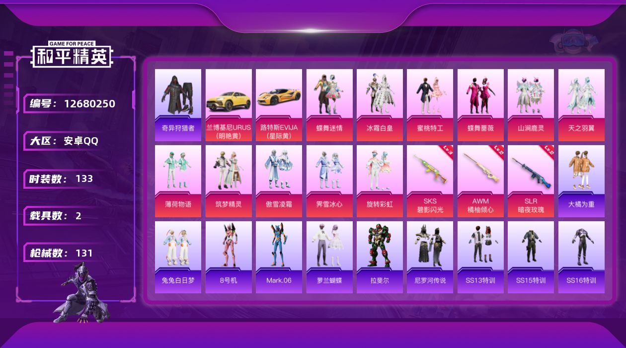 [12680250]【1121】安卓 手Q-11粉装-3特效枪-2载具-2粉色飞行器-49963热力值-3王牌印记-133套装-131枪皮 【热门品类】:套装-奇异狩猎者,角色-8号机,角色-Mark.06 【粉色载具】:兰博基尼URUS(明艳黄),路特斯EVIJA(星际黄) 【粉色套装】:粉装-蝶舞迷情,粉装-冰霜白皇,粉装-蜜桃特工,粉装-蝶舞蔷薇,粉装-山涧鹿灵,粉装-天之羽翼,粉装-薄荷物语,粉装-筑梦精灵,粉装-傲雪凌霜,粉装-霁雪冰心,粉装-旋转彩虹 【粉色枪皮等级】:AWM-橘柚倾心(二级),SKS-碧影闪光(三级),SLR-暗夜玫瑰(二级) 【粉色枪皮】:AWM-橘柚倾心,SKS-碧影闪光,SLR-暗夜玫瑰 【粉色飞行器】:天之羽翼飞行器,翩跹演武飞行器 【粉色降落伞】:甜心宝贝降落伞,神秘黑猫降落伞,暗翼战神降落伞,星之彼岸降落伞,烈焰拳霸降落伞,枪炮玫瑰降落伞,暗夜玫瑰降落伞,天之羽翼降落伞,橘柚倾心降落伞,炙焰牛王降落伞,垂柳戏鸭降落伞,守护天翼降落伞,忍者神龟降落伞 【稀有套装】:套装-萝兰蝴蝶,角色-拉斐尔,套装-尼罗河传说 【稀有枪皮】:AKM-奇异狩猎者,AKM-彩虹符号,AKM-灼热熔岩,AKM-破晓战魂,AKM-萌趣颜团子,AKM-虎虎生威,M16A4-幻世战舞者,M16A4-甜心亚梦,M16A4-蓝色火焰,SCAR-L-暗夜玫瑰,SCAR-L-玉兔迎春,SCAR-L-碧影闪光,M416-红色方程式,M416-蓝色火焰,GROZA-异彩先驱,GROZA-彩虹符号,AUG-天降萌叽,AUG-灵符少年,AUG-耀粉歌者,AUG-青春冒险家,QBZ-彩虹符号,QBZ-暗翼战神,QBZ-神秘黑猫,QBZ-飞驰魅影,M762-奇异狩猎者,M762-枪炮玫瑰,M762-橘柚倾心,M762-瑞龙福将,M762-绒雪飘舞,Mk47-天之羽翼,Mk47-青春冒险家,G36C-古战神甲,G36C-暗夜玫瑰,AC-VAL-天降萌叽,AC-VAL-甜心亚梦,蜜獾-垂柳戏鸭,蜜獾-娇憨猪猪,UZI-娇憨猪猪,UZI-炫彩节奏,UZI-红色方程式,UMP45-生命誓言,Vector-治愈之星,Vector-生命誓言,汤姆逊-奇异狩猎者,汤姆逊-异彩先驱,汤姆逊-炫彩节奏,汤姆逊-耀粉歌者,野牛-青春冒险家,MP5K-异彩先驱,P90-筑梦精灵,P90-飞驰魅影,Kar98K-梦