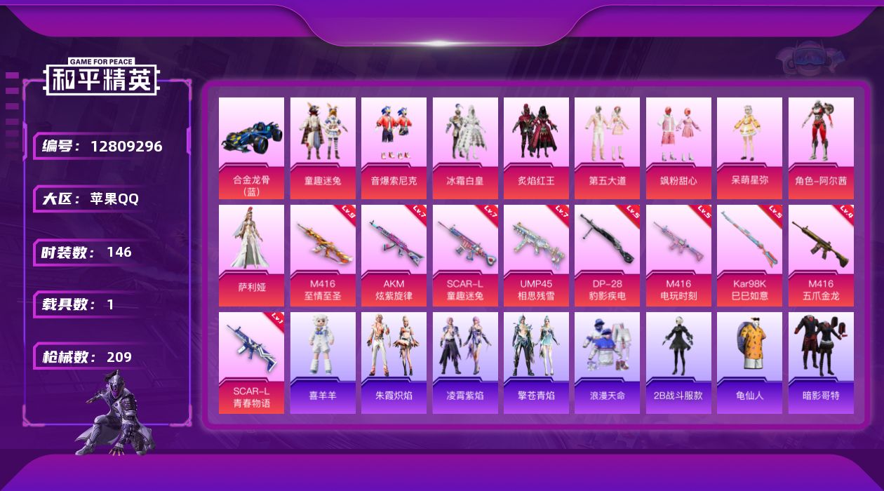 [12809296]【1196】苹果 手Q-9粉装-9特效枪-1载具-1粉色飞行器-67343热力值-15王牌印记-146套装-209枪皮