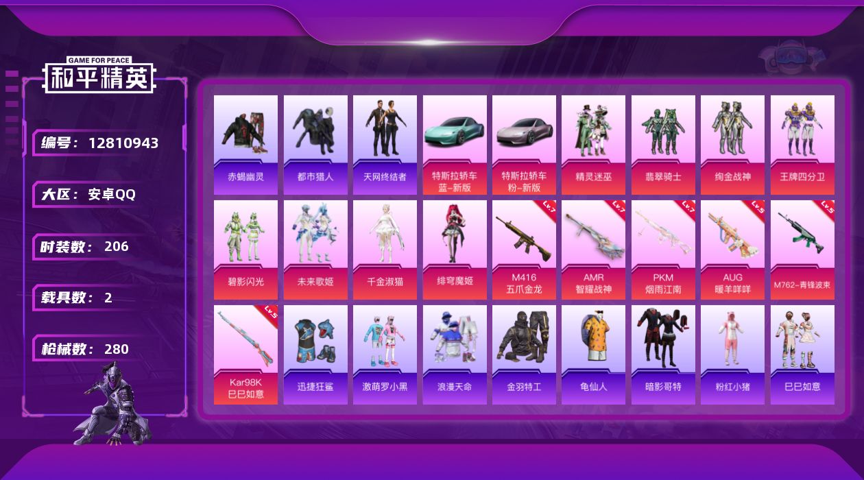 [12810943]【1217】安卓 手Q-8粉装-6特效枪-2载具-2粉色飞行器-88062热力值-19王牌印记-206套装-280枪皮 【热门品类】:套装-浪漫天命,套装-赤蝎幽灵,套装-都市猎人,套装-天网终结者,套装-金羽特工,套装-龟仙人,套装-暗影哥特,套装-粉红小猪 【粉色载具】:特斯拉Roadster(水滴蓝),特斯拉Roadster(沁心粉),空客H135-蔚蓝之翼 【粉色套装】:粉装-精灵迷巫,粉装-翡翠骑士,粉装-绚金战神,粉装-王牌四分卫,粉装-碧影闪光,粉装-未来歌姬,角色-千金淑猫,角色-绯穹魔姬 【粉色枪皮等级】:M416-五爪金龙(七级),AUG-暖羊咩咩(五级),M762-青锋波束(五级),Kar98K-巳巳如意(五级),AMR-智耀战神(七级),PKM-江南烟雨(七级) 【粉色枪皮】:M416-五爪金龙,AUG-暖羊咩咩,M762-青锋波束,Kar98K-巳巳如意,AMR-智耀战神,PKM-江南烟雨 【粉色飞行器】:终极赛罗飞行器,王牌四分卫飞行器 【粉色降落伞】:甜心宝贝降落伞,夏日绵绵冰降落伞,银刃赛罗降落伞,王牌四分卫降落伞,暗夜玫瑰降落伞,蓝莓炮弹降落伞,绿意幻情降落伞,炙焰牛王降落伞,垂柳戏鸭降落伞,第五大道降落伞,猪猪侠降落伞,精灵梦叶罗丽降落伞,金丰海韵降落伞 【稀有套装】:套装-龟仙人,套装-巳巳如意,套装-糖糖葫芦,套装-青团波波,套装-棉花软糖,角色-摩登魅猫,套装-燕燕于飞,套装-鱼渊荷华,角色-海琴烟,套装-闪电轻猫,角色-糖霜甜心,套装-粉恋花,套装-紫幽梦,套装-蓝冰羽,套装-星渊小夜曲,套装-霓虹热舞,套装-云朵鹅,套装-雪绒豹 【稀有枪皮】:AKM-冰凉西瓜,AKM-夜灯,AKM-彩虹符号,AKM-灼热熔岩,AKM-生命誓言,AKM-破晓战魂,AKM-萌趣颜团子,AKM-虎虎生威,AKM-霓虹街区,AKM-龙的传人,M16A4-幻世战舞者,M16A4-甜心亚梦,M16A4-红色方程式,M16A4-蓝色火焰,SCAR-L-夏日绵绵冰,SCAR-L-夜灯,SCAR-L-炫彩节奏,SCAR-L-玉兔迎春,SCAR-L-王牌四分卫,SCAR-L-红色方程式,M416-夜灯,M416-暗夜行者,M416-滑板小狐,M416-糯团青竹,M416-红色方程式,M416-蓝色火焰,GROZA-异彩先驱,GROZA-彩虹符号,GROZ