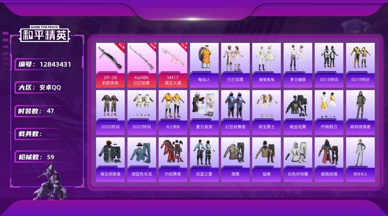 [12843431]【1226】安卓 手Q-0粉装-3特效枪-0载具-0粉色飞行器-15149热力值-1王牌印记-47套装-59枪皮 【热门品类】:套装-龟仙人 【粉色枪皮等级】:Kar98K-巳巳如意(四级),M417-第五大道(三级),DP-28-豹影疾电(五级) 【粉色枪皮】:Kar98K-巳巳如意,M417-第五大道,DP-28-豹影疾电 【粉色降落伞】:忍者神龟降落伞 【稀有套装】:套装-龟仙人,套装-巳巳如意,套装-雏菊兔兔,套装-萝兰蝴蝶 【稀有枪皮】:AKM-彩虹符号,AKM-生命誓言,AKM-龙的传人,M16A4-幻世战舞者,M416-糯团青竹,M416-红色方程式,AUG-耀粉歌者,QBZ-彩虹符号,QBZ-洛神天依,M762-天降萌叽,AC-VAL-天降萌叽,蜜獾-天降萌叽,UMP45-生命誓言,UMP45-蓝色火焰,汤姆逊-天降萌叽,汤姆逊-耀粉歌者,P90-巳巳如意,Kar98K-炫彩节奏,SKS-炫彩节奏,VSS-彩虹符号,Mini14-炫彩节奏,S686-生命誓言,S12K-破晓战魂,S12K-幻世战舞者,DBS-彩虹符号,M249-破晓战魂,MG3-幻世战舞者,战术弩-江南烟雨 【其他套装】:套装-SS18特训,套装-SS19特训,套装-SS20特训,套装-SS22特训,套装-光之冒险,套装-夏日音浪,套装-幻世战舞者,套装-探宝勇士,套装-暗金炫舞,套装-柠萌假日,套装-森林游猎者,套装-海岛探路者,套装-湖蓝色名流,套装-灼焰舞者,套装-炫蓝之夏,套装-猎鹰,套装-猛禽,套装-白色伏地魔,套装-破晓战魂,套装-竞技名士,套装-红色运动,套装-绯格组合,套装-缤纷果语,套装-耀粉歌者,套装-虎虎生威吉莉,套装-都市魅力,套装-长空猛禽,套装-飞行日记,套装-魅力单车,套装-鹤鸣,套装-黄色伏地魔,套装-黄色名流,套装-黄色运动,套装-黑色伏地魔,套装-龙的传人,套装-龟仙人 【营地ID】:751459162