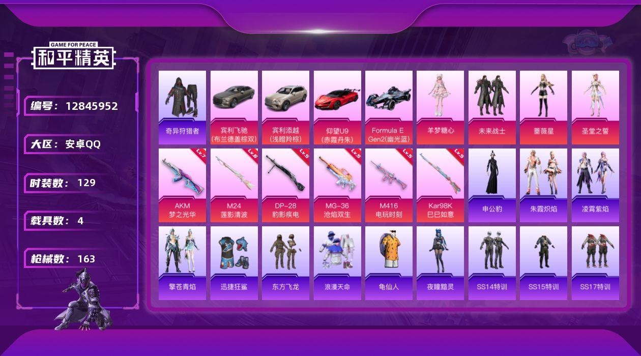 [12845952]【1239】安卓 手Q-4粉装-6特效枪-4载具-2粉色飞行器-57336热力值-11王牌印记-129套装-163枪皮 【热门品类】:套装-浪漫天命,套装-奇异狩猎者,套装-龟仙人 【粉色载具】:宾利飞驰(布罗德盖棕双色),宾利添越(浅瞪羚棕),仰望U9(赤霞丹朱),Formula E Gen2(幽光蓝) 【粉色套装】:粉装-未来战士,角色-蔷薇星,角色-圣堂之誓,角色-羊梦糖心 【粉色枪皮等级】:AKM-梦之光华(七级),M416-电玩时刻(五级),Kar98K-巳巳如意(五级),M24-莲影清波(六级),DP-28-豹影疾电(五级),MG-36-沧焰双生(五级) 【粉色枪皮】:AKM-梦之光华,M416-电玩时刻,Kar98K-巳巳如意,M24-莲影清波,DP-28-豹影疾电,MG-36-沧焰双生 【粉色飞行器】:四圣焕新飞行器,千面幻镜飞行器 【粉色降落伞】:未来战士降落伞,凝视深渊降落伞,荧光虫舞降落伞,激战未来降落伞,暗夜玫瑰降落伞,海渊国主降落伞,太空嘟嘟降落伞,彩虹甜喵降落伞,第五大道降落伞,超新星降落伞 【稀有套装】:套装-龟仙人,角色-夜瞳黯灵,套装-朱霞炽焰,套装-凌霄紫焰,套装-擎苍青焰,角色-申公豹 【稀有枪皮】:AKM-夜灯,AKM-影袭,AKM-星之彼岸,AKM-破晓战魂,AKM-萌趣颜团子,AKM-虎虎生威,M16A4-夜灯,M16A4-幻世战舞者,M16A4-蓝色火焰,SCAR-L-未来战士,SCAR-L-玉兔迎春,SCAR-L-红色方程式,SCAR-L-黄金龙骨,M416-糯团青竹,M416-蓝色火焰,GROZA-治愈之星,GROZA-田园牧歌,AUG-天降萌叽,AUG-耀粉歌者,QBZ-洛神天依,QBZ-飞驰魅影,M762-天降萌叽,M762-瑞龙福将,M762-绯红前夜,Mk47-妙红点点,G36C-暗夜玫瑰,AC-VAL-天降萌叽,AC-VAL-快闪甜心,蜜獾-垂柳戏鸭,蜜獾-天降萌叽,蜜獾-娇憨猪猪,ARX-凌霄紫焰,UZI-啾咪啾咪,UZI-天降萌叽,UZI-娇憨猪猪,UZI-影袭,UZI-红色方程式,UMP45-蓝色火焰,Vector-焰鹰斗篷,Vector-彩虹符号,Vector-治愈之星,Vector-生命誓言,Vector-田园牧歌,汤姆逊-炫彩节奏,汤姆逊-耀粉歌者,MP5K-蓝莓炮弹,JS9-凌霄紫焰,P90