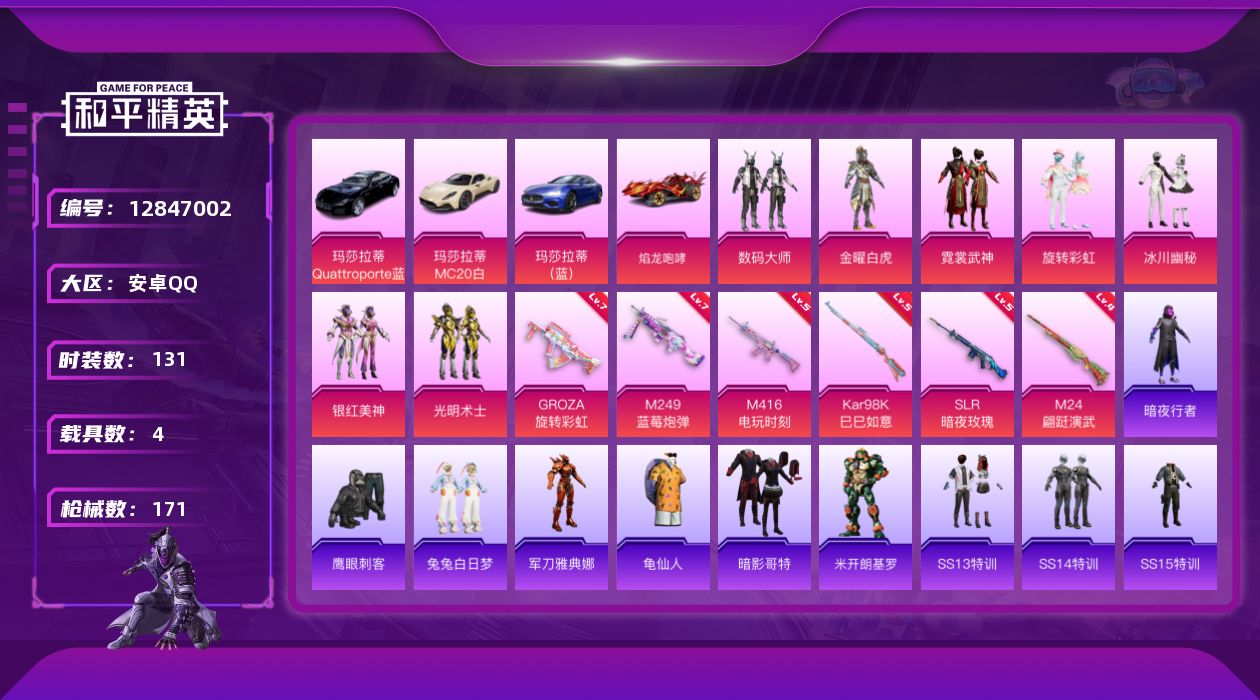 [12847002]【1242】安卓 手Q-7粉装-6特效枪-4载具-1粉色飞行器-60558热力值-10王牌印记-131套装-171枪皮