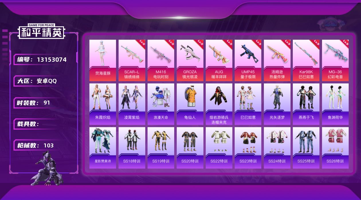 [13153074]【1414】安卓 手Q-1粉装-8特效枪-0载具-0粉色飞行器-30091热力值-4王牌印记-91套装-103枪皮