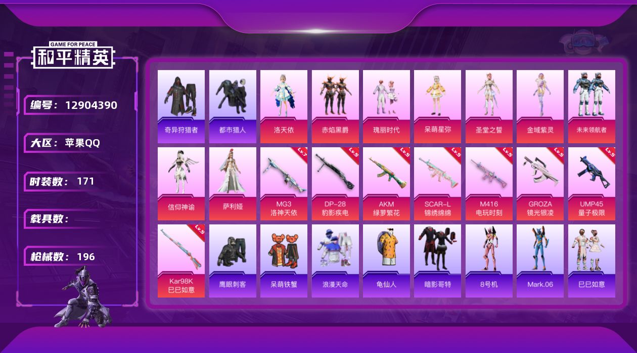 [12904390]【1451】苹果 手Q-9粉装-8特效枪-0载具-4粉色飞行器-63652热力值-13王牌印记-171套装-196枪皮 【热门品类】:套装-浪漫天命,套装-都市猎人,套装-奇异狩猎者,套装-龟仙人,套装-暗影哥特,角色-8号机,角色-Mark.06 【粉色套装】:角色-洛天依,粉装-赤焰黑爵,粉装-瑰丽时代,角色-呆萌星弥,角色-圣堂之誓,角色-金域紫灵,粉装-未来领航者,角色-信仰神谕,角色-萨利娅 【粉色枪皮等级】:AKM-绿萝繁花(五级),SCAR-L-锦绣绵绵(五级),M416-电玩时刻(五级),GROZA-镜光银凌(五级),UMP45-量子极限(五级),Kar98K-巳巳如意(五级),DP-28-豹影疾电(五级),MG3-洛神天依(七级) 【粉色枪皮】:AKM-绿萝繁花,SCAR-L-锦绣绵绵,M416-电玩时刻,GROZA-镜光银凌,UMP45-量子极限,Kar98K-巳巳如意,DP-28-豹影疾电,MG3-洛神天依 【粉色飞行器】:梦幻火箭飞行器,星夜魔法师飞行翼,信仰神谕飞行器,万象金身飞行器 【粉色降落伞】:洛神天依降落伞,暗星紫秘降落伞,冷魅冰骑降落伞,星夜魔法师降落伞,垂柳戏鸭降落伞,彩虹甜喵降落伞,第五大道降落伞,白勺歌姬降落伞,未来歌姬降落伞,炫光之旅降落伞,镜光幻境降落伞,守护天翼降落伞,初号机 觉醒Ver.降落伞,拳皇·狂花道降落伞,未来领航者降落伞,临安公主降落伞,信仰神谕降落伞,月影灵韵降落伞,幻影飞狐降落伞 【稀有套装】:套装-龟仙人,套装-巳巳如意,套装-雏菊兔兔,套装-萝兰蝴蝶,套装-小熊娃娃,套装-糖糖葫芦,套装-青团波波,套装-棉花软糖,角色-摩登魅猫,套装-净心行者,角色-许七安,套装-黑曜寓言,角色-光矢逐梦,套装-燕燕于飞,套装-鱼渊荷华,角色-糖霜甜心 【稀有枪皮】:AKM-彩虹符号,AKM-影袭,AKM-灼热熔岩,AKM-生命誓言,AKM-破晓战魂,AKM-虎虎生威,AKM-霓虹街区,AKM-龙的传人,M16A4-幻世战舞者,M16A4-红色方程式,M16A4-蓝色火焰,SCAR-L-夜灯,SCAR-L-玉兔迎春,SCAR-L-红色方程式,SCAR-L-净心行者,M416-糯团青竹,M416-红色方程式,M416-绯红前夜,M416-蓝色火焰,GROZA-影袭,GROZA-恐龙拽拽,GROZA-懵萌河马,GRO