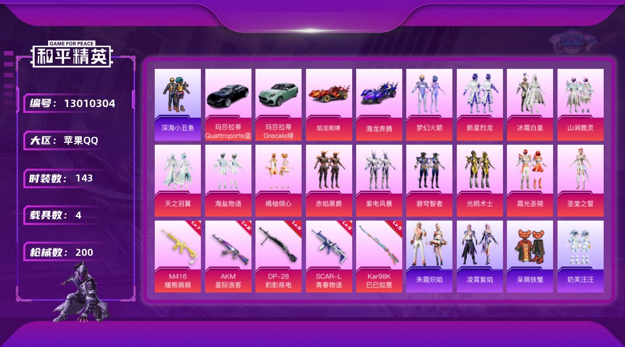 [13010304]【1463】苹果 手Q-13粉装-5特效枪-4载具-3粉色飞行器-68252热力值-9王牌印记-143套装-200枪皮