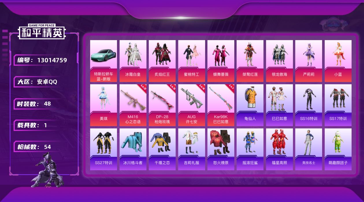 [13014759]【1490】安卓 手Q-9粉装-4特效枪-1载具-1粉色飞行器-21548热力值-1王牌印记-48套装-54枪皮 【热门品类】:套装-龟仙人 【粉色载具】:特斯拉Roadster(水滴蓝) 【粉色套装】:粉装-冰霜白皇,粉装-炙焰红王,粉装-蜜桃特工,粉装-蝶舞蔷薇,粉装-桀骜红莲,粉装-银龙傲海,角色-严莉莉,角色-小蓝,角色-美琪 【粉色枪皮等级】:M416-心之恋语(五级),AUG-许七安(四级),Kar98K-巳巳如意(一级),DP-28-枪炮玫瑰(五级) 【粉色枪皮】:M416-心之恋语,AUG-许七安,Kar98K-巳巳如意,DP-28-枪炮玫瑰 【粉色飞行器】:巴啦啦小魔仙飞行器 【粉色降落伞】:四圣焕新降落伞,花间之火降落伞,江南烟雨降落伞,巴啦啦小魔仙降落伞 【稀有套装】:套装-龟仙人,套装-巳巳如意 【稀有枪皮】:AKM-四圣焕新,AKM-萌趣颜团子,AKM-虎虎生威,M16A4-幻世战舞者,SCAR-L-夏日绵绵冰,AUG-天降萌叽,QBZ-彩虹符号,QBZ-电玩视界,M762-深海曼妙,M762-瑞龙福将,Mk47-洛神天依,G36C-时空追击者,AC-VAL-天降萌叽,蜜獾-天降萌叽,UZI-炫彩节奏,UMP45-时空追击者,Vector-焰鹰斗篷,汤姆逊-花间之火,AWM-焰鹰斗篷,SKS-时空追击者,VSS-星之彼岸,VSS-枪炮玫瑰,Win94-瑞龙福将,SLR-四圣焕新,S686-深海曼妙,S686-生命誓言,S12K-瑞龙福将,DBS-焰鹰斗篷,DBS-时空追击者,M249-四圣焕新,M249-焰龙焚天,DP-28-焰鹰斗篷,DP-28-彩虹符号,MG3-幻世战舞者,MG3-瑞龙福将,短管霰弹-竹节火铳,爆炸猎弓-喜羊羊与灰太狼 【其他套装】:套装-SS16特训,套装-SS17特训,套装-SS27特训,套装-冰川格斗者,套装-千禧之恋,套装-吉莉礼服,套装-怒火燎原,套装-摇滚狂鲨,套装-福星高照,套装-竞技名士,套装-萌趣颜团子,套装-长空猛禽,套装-骑行爱好者,套装-龟仙人,套装-刚毅裁决者,套装-冰冻风暴,套装-冰川特警,套装-浴火魔神,套装-奇趣章鱼,套装-摩艾涂鸦,套装-清香五月粽,套装-软嫩糖心蛋,套装-青龙圣者,套装-朱雀圣者,套装-玄武圣者,套装-本愿之火,套装-辉星之火,套装-暴风机械师,套装-时空追击者,套装