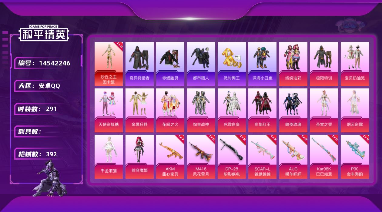 [14542246]【1631】安卓 手Q-无敌战神框-1神装-14粉装-11特效枪-0载具-6粉色飞行器-126848热力值-25王牌印记-291套装-392枪皮