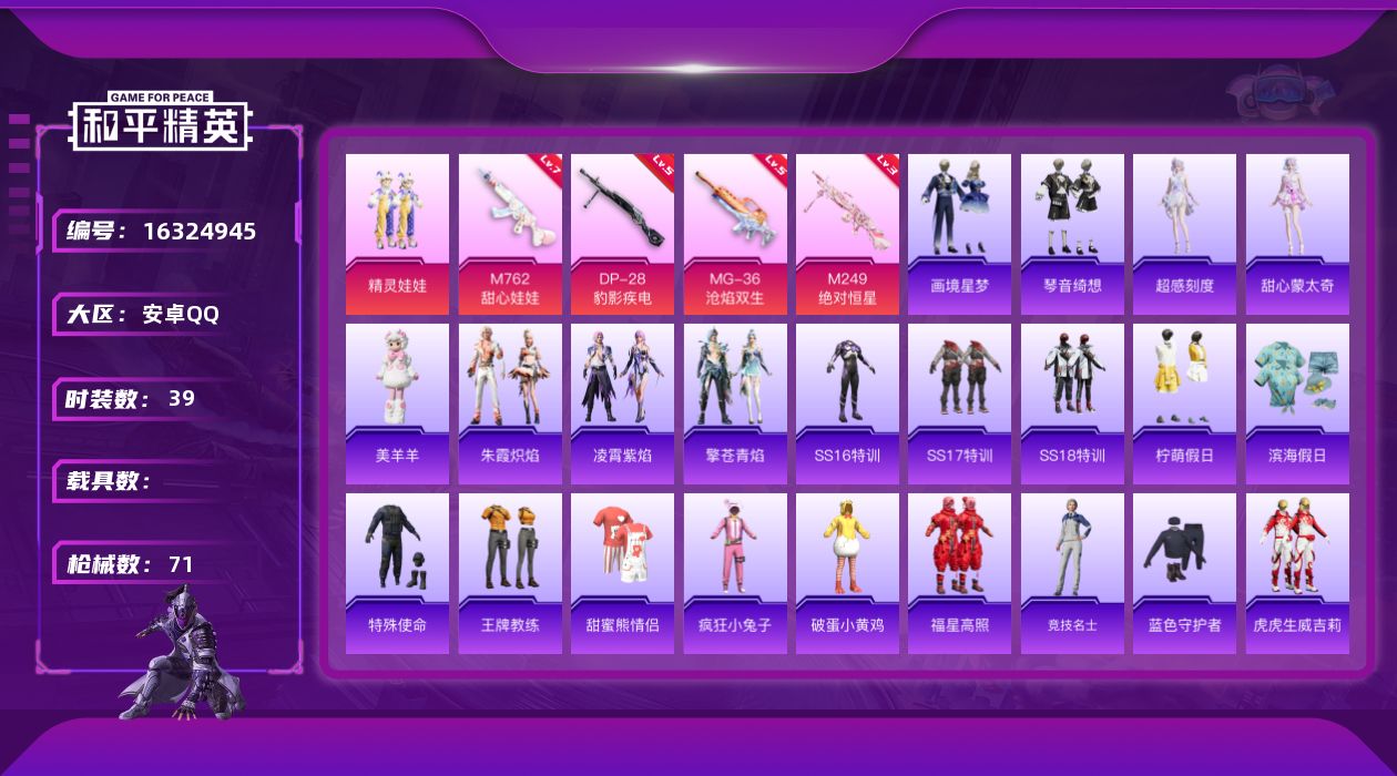 [16324945]安卓 手Q-1粉装-4特效枪-0载具-1粉色飞行器-19993热力值-5王牌印记-39套装-71枪皮【粉色套装】:粉装-精灵娃娃【粉色枪皮等级】:M762-甜心娃娃(七级),M249-绝对恒星(三级),DP-28-豹影疾电(五级),MG-36-沧焰双生(五级)【粉色枪皮】:M762-甜心娃娃,M249-绝对恒星,DP-28-豹影疾电,MG-36-沧焰双生