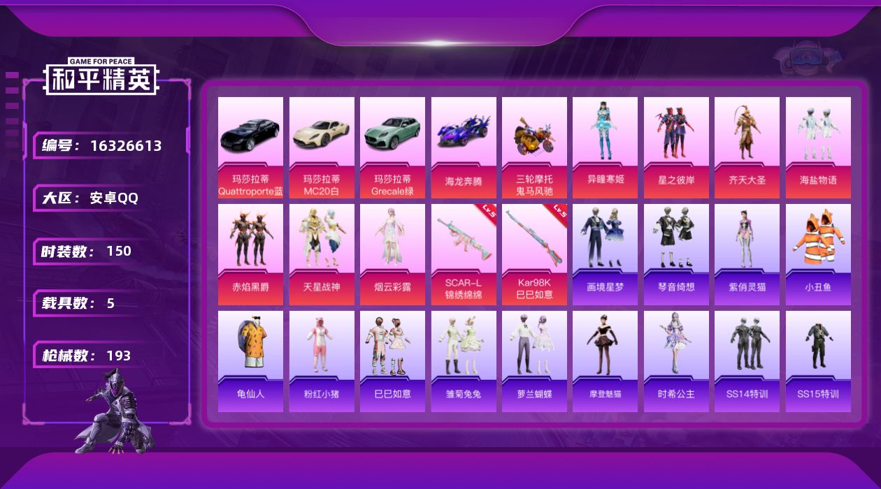 [16326613]【特价出售/店主推荐】安卓 手Q-7粉装-2特效枪-5载具-2粉色飞行器-62420热力值-5王牌印记-150套装-193枪皮【热门品类】:套装-小丑鱼,套装-龟仙人,套装-粉红小猪【粉色套装】:粉装-星之彼岸,粉装-齐天大圣,粉装-海盐物语,粉装-赤焰黑爵,粉装-天星战神,角色-烟云彩露,角色-异瞳寒姬【粉色枪皮等级】:SCAR-L-锦绣绵绵(五级),Kar98K-巳巳如意(五级)【粉色载具】:玛莎拉蒂MC20(星石白),玛莎拉蒂Quattroporte(夜幕蓝),玛莎拉蒂Grecale(薄荷绿),海龙奔腾,鬼马风驰【粉色枪皮】:SCAR-L-锦绣绵绵,Kar98K-巳巳如意【粉色飞行器】:冷魅冰骑飞行器