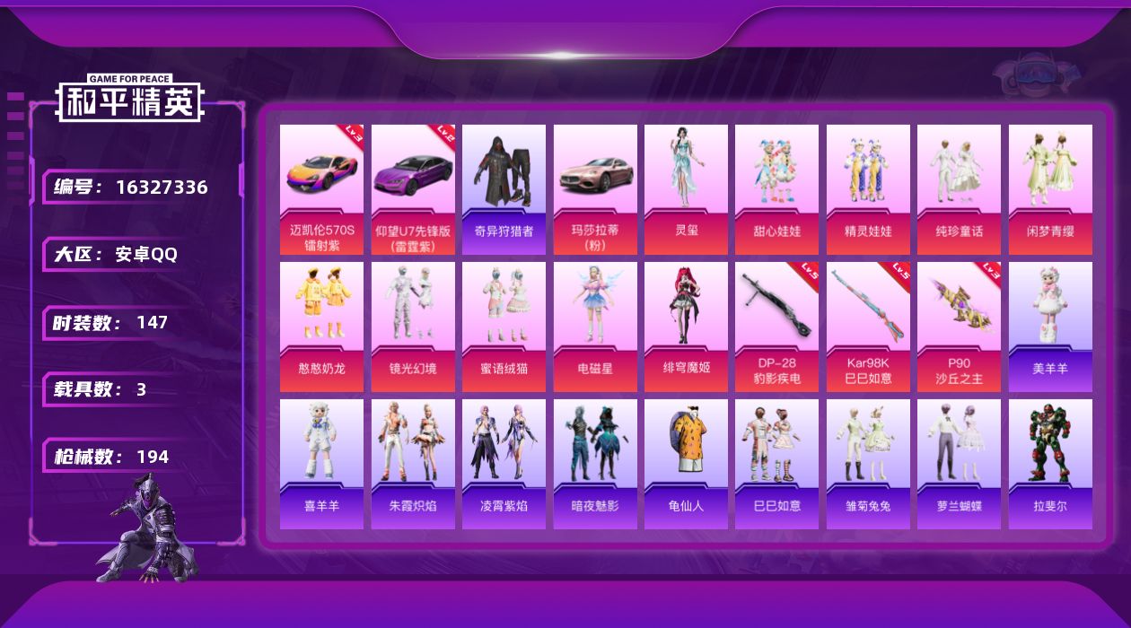 [16327336]【特价出售/店主推荐】安卓 手Q-10粉装-3特效枪-3载具-3粉色飞行器-64607热力值-8王牌印记-147套装-194枪皮【红色载具】:迈凯伦570S(镭射紫)(三级),仰望U7(雷霆紫)(二级)【热门品类】:套装-奇异狩猎者,套装-龟仙人,撬棍-龙胆亮银枪【粉色套装】:粉装-甜心娃娃,粉装-精灵娃娃,粉装-纯珍童话,粉装-闲梦青缨,粉装-憨憨奶龙,粉装-镜光幻境,粉装-蜜语绒猫,角色-电磁星,角色-绯穹魔姬,角色-灵玺【粉色枪皮等级】:P90-沙丘之主(三级),Kar98K-巳巳如意(五级),DP-28-豹影疾电(五级)【粉色载具】:玛莎拉蒂Ghibli(粉),仰望U7(雷霆紫),迈凯伦570S(镭射紫)【粉色枪皮】:P90-沙丘之主,Kar98K-巳巳如意,DP-28-豹影疾电【粉色飞行器】:沙丘之主天马,魔法神域飞行器,飞天猪飞行器