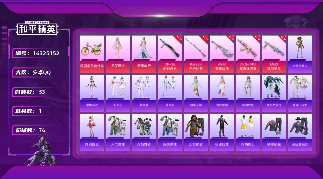 [16325152]【特价出售/店主推荐】安卓 手Q-2粉装-5特效枪-1载具-3粉色飞行器-21890热力值-3王牌印记-53套装-76枪皮【热门品类】:角色-六号稻草人【粉色套装】:角色-智耀战神,角色-羊梦糖心【粉色枪皮等级】:AKS-74U-星穹咏叹调(四级),Kar98K-巳巳如意(五级),AMR-智耀战神(五级),DP-28-豹影疾电(五级),MG3-辉羽雀灵(三级)【粉色载具】:辉羽雀灵自行车【粉色枪皮】:AKS-74U-星穹咏叹调,Kar98K-巳巳如意,AMR-智耀战神,DP-28-豹影疾电,MG3-辉羽雀灵【粉色飞行器】:圣域金龙飞行器,雀灵庇佑飞行器