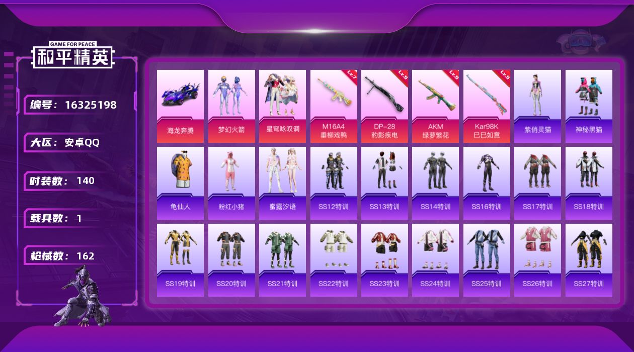 - [15141862]安卓 手Q-4粉装-7特效枪-4.8w热力值-6王牌印记-116套装-174枪皮【热门品类】:套装-龟仙人,套装-暗影哥特【粉色套装】:粉装-宝贝奶油派,粉装-天使彩虹糖,粉装-炫光之旅,粉装-幻影飞狐【粉色枪皮等级】:SCAR-L-锦绣绵绵(五级),M416-电玩时刻(五级),UMP45-量子极限(五级),Kar98K-巳巳如意(五级),DP-28-豹影疾电(五级),MG-36-沧焰双生(五级),平底锅-喜羊羊与灰太狼(六级)