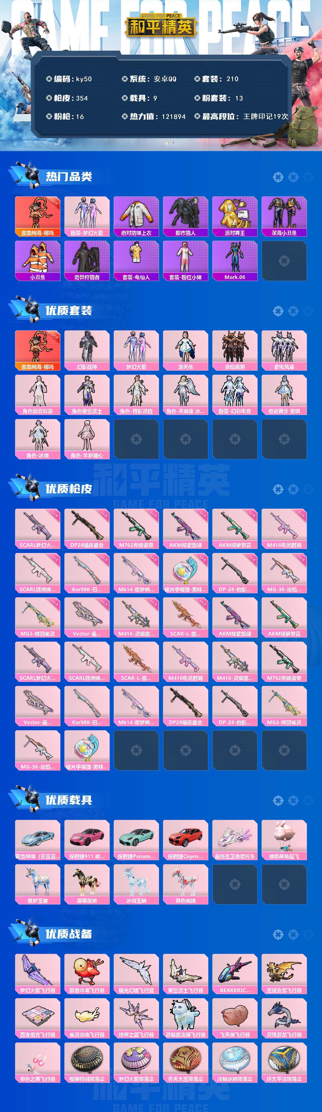 [16704337]安卓 手Q-1神装-13粉装-16特效枪-9载具-15粉色飞行器-121894热力值-19王牌印记-210套装-354枪皮 【红色神装等级】:魔童闹海-哪吒(二级) 【红色角色神装】:魔童闹海-哪吒 【热门品类】:粉装-梦幻火箭,绝对防御上衣,套装-都市猎人,套装-派对舞王,套装-深海小丑鱼,套装-小丑鱼,套装-奇异狩猎者,套装-龟仙人,套装-粉红小猪,角色-Mark.06 【粉色套装】:粉装-幻影战神,粉装-梦幻火箭,角色-洛天依,粉装-赤焰黑爵,粉装-紫电风暴,角色-烟云彩露,角色-星空武士,角色-月影灵韵,角色-天鹅座 冰河,粉装-幻彩电音,角色-奇迹舞步 美琪,角色-冰魄,角色-羊梦糖心 【粉色枪皮等级】:AKM-炫紫旋律(五级),AKM-绿萝繁花(五级),SCAR-L-梦幻火箭(六级),SCAR-L-锦绣绵绵(五级),SCAR-L-魔童闹海 哪吒(三级),M416-电玩时刻(五级),M416-灵猫魔法师(三级),M762-青锋波束(五级),Vector-最终圣卫者(三级),Kar98K-巳巳如意(五级),Mk14-甜梦熊击(五级),DP-28-暗夜鎏金(六级),DP-28-豹影疾电(五级),MG3-辉羽雀灵(三级),MG-36-沧焰双生(五级),破片手榴弹-美味星星糖(五级) 【粉色载具】:霜龙神御(云雾蓝),保时捷911 敞篷版(星珀红),保时捷Panamera(梦幻青),保时捷Cayenne(激情红),最终圣卫者摩托车,僚机-萌兔起飞,星梦玉骢,黑曜夜骑,冰绡玉鳞,暮色幽蹄 【粉色枪皮】:AKM-炫紫旋律,AKM-绿萝繁花,SCAR-L-梦幻火箭,SCAR-L-锦绣绵绵,SCAR-L-魔童闹海 哪吒,M416-电玩时刻,M416-灵猫魔法师,M762-青锋波束,Vector-最终圣卫者,Kar98K-巳巳如意,Mk14-甜梦熊击,DP-28-暗夜鎏金,DP-28-豹影疾电,MG3-辉羽雀灵,MG-36-沧焰双生,破片手榴弹-美味星星糖 【粉色飞行器】:梦幻火箭飞行器,歌者泠鸢飞行器,镜光幻境飞行翼,星空武士飞行器,BEARBRICK飞行器,圣域金龙飞行器,百变魔方飞行器,雀灵庇佑飞行器,终晖之翼飞行器,灵猫魔法师飞行器,飞天猪飞行器,灵珠游龙飞行器,暮色之舞飞行器 【粉色降落伞】:极限特训降落伞,梦幻火箭降落伞,齐天大圣降落伞,冷魅冰骑降落伞,环太平