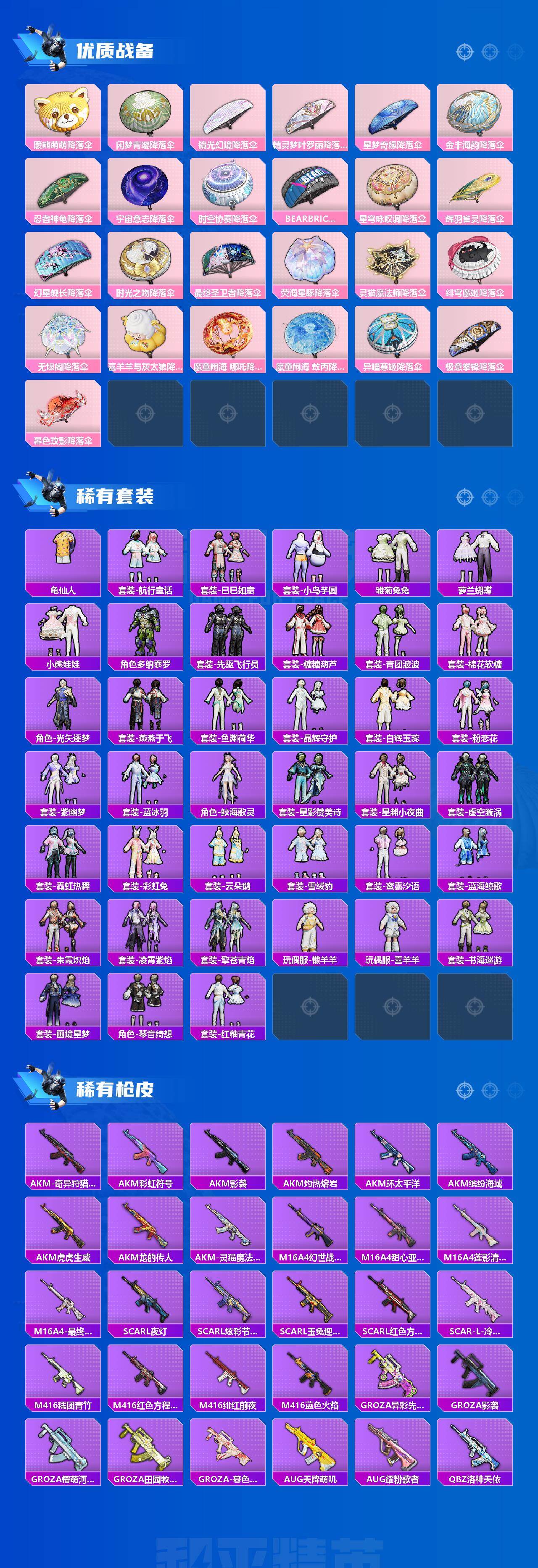 【粉色枪皮】:AKM-炫紫旋律,AKM-绿萝繁花,SCAR-L-梦幻火箭,SCAR-L-锦绣绵绵,SCAR-L-魔童闹海 哪吒,M416-电玩时刻,M416-灵猫魔法师,M762-青锋波束,Vector-最终圣卫者,Kar98K-巳巳如意,Mk14-甜梦熊击,DP-28-暗夜鎏金,DP-28-豹影疾电,MG3-辉羽雀灵,MG-36-沧焰双生,破片手榴弹-美味星星糖