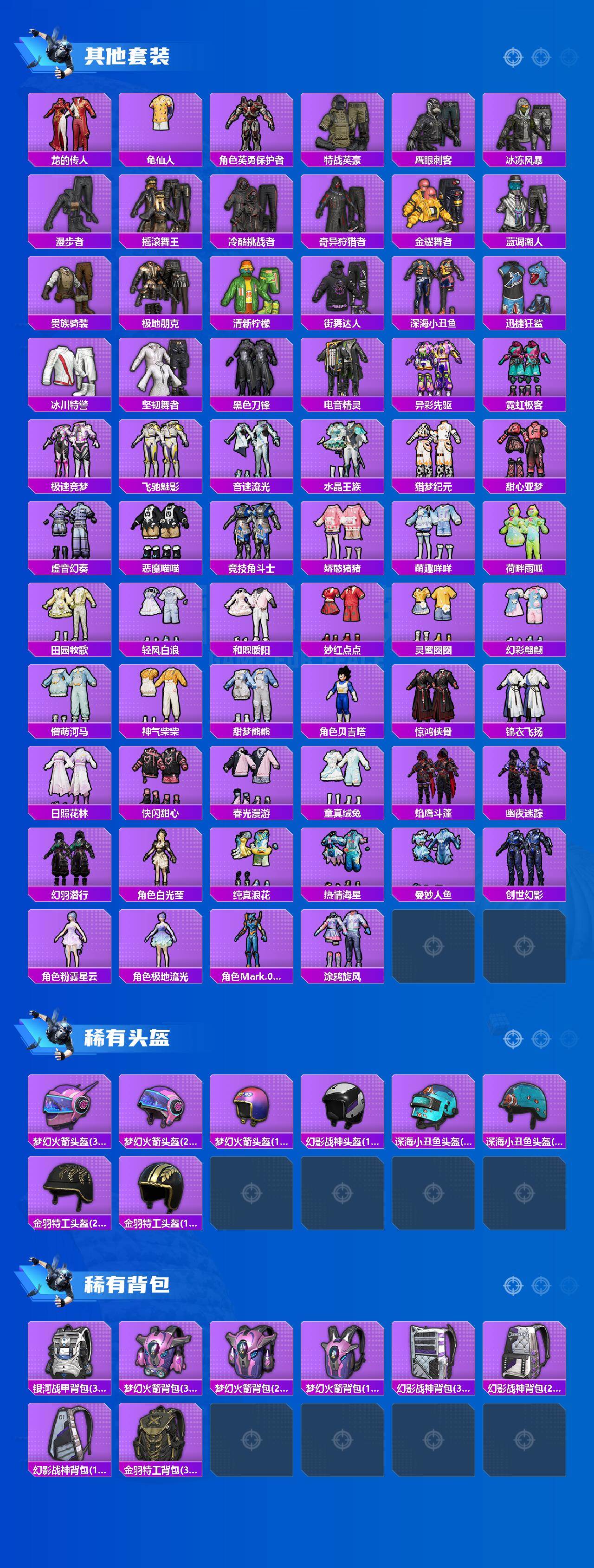 套装-梦幻火箭,套装-都市猎人,套装-派对舞王,套装-深海小丑鱼,套装-奇异狩猎者,套装-幻影战神,角色-洛天依,套装-赤焰黑爵,套装-紫电风暴,角色-烟云彩露,角色-星空武士,角色-月影灵韵,套装-鹰眼刺客,套装-迅捷狂鲨,套装-恶魔喵喵