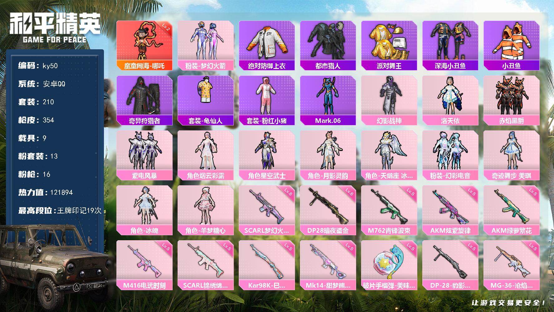 [16704337]安卓 手Q-1神装-13粉装-16特效枪-9载具-15粉色飞行器-121894热力值-19王牌印记-210套装-354枪皮