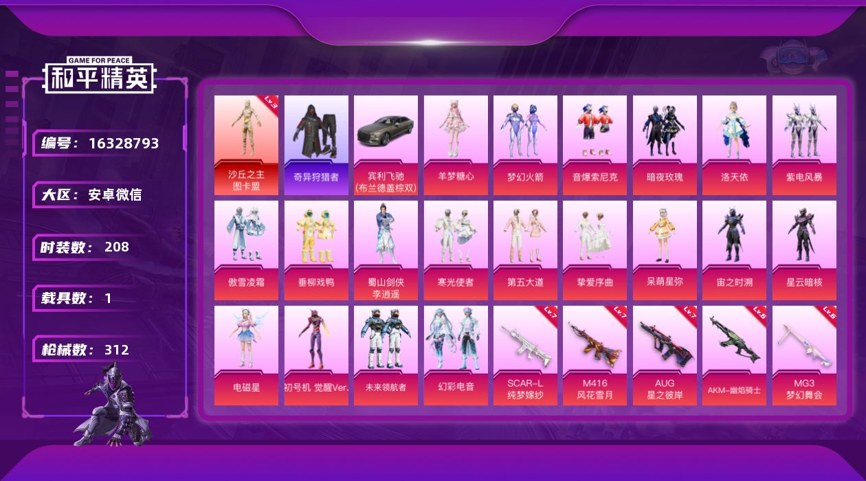 [16328793]【特价出售/店主推荐】安卓 微信-1神装-19粉装-16特效枪-1载具-16粉色飞行器-114669热力值-19王牌印记-208套装-312枪皮【红色神装等级】:沙丘之主-图卡盟(三级)【红色角色神装】:沙丘之主-图【热门品类】:粉装-梦幻火箭,粉装-音爆索尼克,套装-奇异狩猎者,套装-暗夜行者,角色-2P战斗服款,套装-龟仙人,套装-暗影哥特,角色-Mark.06【粉色套装】:粉装-梦幻火箭,粉装-暗夜玫瑰,角色-洛天依,粉装-紫电风暴,粉装-傲雪凌霜,粉装-垂柳戏鸭,蜀山剑侠-李逍遥,粉装-寒光使者,粉装-音爆索尼克,粉装-第五大道,粉装-挚爱序曲,角色-呆萌星弥,角色-宙之时溯,角色-星云暗核,角色-电磁星,角色-初号机 觉醒Ver.,粉装-未来领航者,粉装-幻彩电音,角色-羊梦糖心【粉色枪皮等级】:AKM-绿萝繁花(五级),AKM-魔法神域(三级),AKM-幽焰骑士(六级),M16A4-垂柳戏鸭(一级),SCAR-L-纯梦嫁纱(七级),M416-风花雪月(七级),AUG-星之彼岸(七级),AUG-超新星(一级),UMP45-量子极限(五级),P90-沙丘之主(三级),Kar98K-巳巳如意(五级),M24-镜域双华(三级),Mk14-甜梦熊击(五级),DP-28-豹影疾电(五级),MG3-梦幻舞会(六级),PKM-江南烟雨(四级)【粉色载具】:宾利飞驰(布罗德盖棕双色)【粉色枪皮】:AKM-绿萝繁花,AKM-魔法神域,AKM-幽焰骑士,M16A4-垂柳戏鸭,SCAR-L-纯梦嫁纱,M416-风花雪月,AUG-星之彼岸,AUG-超新星,UMP45-量子极限,P90-沙丘之主,Kar98K-巳巳如意,M24-镜域双华,Mk14-甜梦熊击,DP-28-豹影疾电,MG3-梦幻舞会,PKM-江南烟雨【粉色飞行器】:酣梦熊熊飞行器,梦幻火箭飞行器,星之彼岸飞行器,天之羽翼飞行器,星夜魔法师飞行翼,梦幻舞会飞行器,萌物绒绒飞行器,沙丘之主天马,镜域双华-灵镜之阶,龙翔九天飞行器,幽焰列车飞行器,凤舞九天飞行器,万象金身飞行器,极意拳锋飞行器