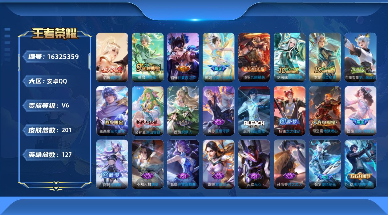 [16325359]安卓Q-V6-永恒钻石I段位-127英雄-200皮肤-5传说-58史诗
