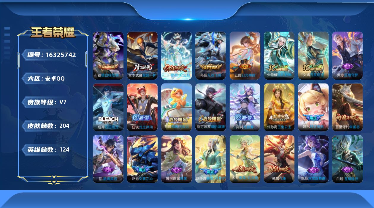 [16325742]可二次【特价出售/店主推荐】安卓Q-V7-至尊星耀IV段位-124英雄-204皮肤-1典藏皮肤-1珍品传说-4传说-58史诗