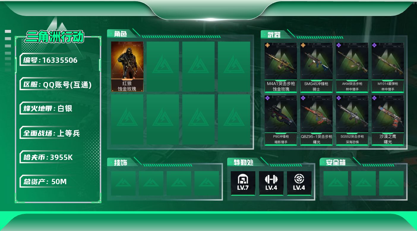 [16335506]【特价出售/店主推荐】50m总资产-3955k哈伏币-49烽火等级-白银-49战场等级-上等兵 【干员外观】:红狼-蚀金玫瑰 【近战皮肤】:近战-黑鹰 【传说外观】:M4A1突击步枪-蚀金玫瑰,SMG-45冲锋枪-骑士 【史诗外观】:AKM突击步枪-林中猎手,QBZ95-1突击步枪-曙光,SG552突击步枪-深海恐惧,P90冲锋枪-暗影猎手,Vector冲锋枪-阿萨拉文明,勇士冲锋枪-深海恐惧,M1014霰弹枪-林中猎手,沙漠之鹰-曙光 【稀有外观】:AKM突击步枪-浅鲨小队,K416突击步枪-街头涂鸦,AUG突击步枪-全金属外壳,SCAR-H战斗步枪-童趣,AS Val突击步枪-哈夫克科技,P90冲锋枪-医疗协议,P90冲锋枪-街头涂鸦,P90冲锋枪-新生,Vector冲锋枪-先锋,SMG-45-行动开启,SMG-45冲锋枪-幻影结构,MP7冲锋枪-幻影结构,M1014霰弹枪-幻影结构,M249轻机枪-战损,M250通用机枪-前沿科技,M14射手步枪-出厂配置,SKS射手步枪-弄臣,SR-25射手步枪-开拓,SV-98狙击步枪-星链科技,SV-98狙击步枪-哈夫克航天,SV-98狙击步枪-精英联盟,G18-星链科技,G18-哈夫克航天 【普通外观】:野牛冲锋枪-黄铜,M870霰弹枪-马赛克涂装,SV-98狙击步枪-马赛克涂装,M4A1突击步枪-粉色涂装,M4A1突击步枪-高雅黑,M4A1突击步枪-海色,QBZ95-1突击步枪-高雅黑,QBZ95-1突击步枪-海色,QBZ191突击步枪-三角洲力量,K416突击步枪-几何迷彩,K416突击步枪-高雅黑,AUG突击步枪-浅蓝涂装,M7战斗步枪-红色涂装,SG552突击步枪-浅蓝涂装,SG552突击步枪-海浪,AK-12突击步枪-冰川,AK-12突击步枪-落花,SCAR-H战斗步枪-数码迷彩,G3战斗步枪-高雅黑,MP5冲锋枪-安全工作,MP5冲锋枪-海色,P90冲锋枪-安全工作,UZI冲锋枪-海色,QCQ171冲锋枪-三角洲力量,M1014霰弹枪-高雅黑,QJB201轻机枪-三角洲力量,SV-98狙击步枪-红色涂装,沙漠之鹰-海浪,M1911-坚固材料 【载具外观】:轮式突击炮-荣耀,全地形车-纷争 【军牌】:军牌-三角小子,军牌-装备修理,军牌-展示,军牌-黑鹰不朽,军牌-享受音乐,军牌-永恒,军牌-零号大坝,军牌