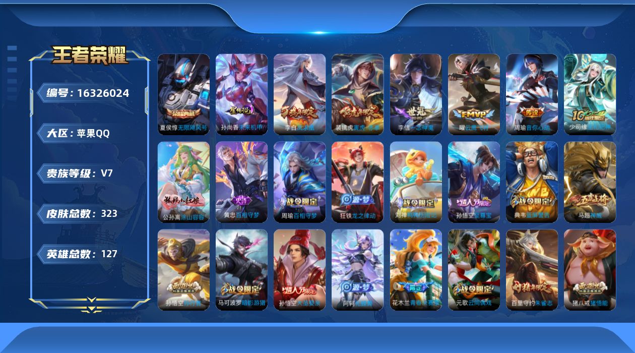 [16326024]苹果Q-V7-永恒钻石II段位-127英雄-323皮肤-1典藏皮肤-6传说-87史诗
