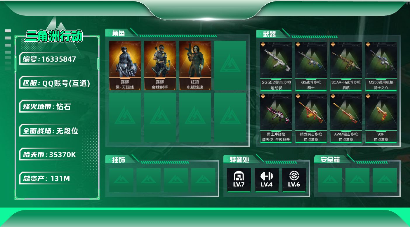 [16335847]【特价出售/店主推荐】131m总资产-35370k哈伏币-60烽火等级-钻石-5战场等级-无军衔 【干员外观】:露娜-黑·天际线,红狼-电锯惊魂,露娜-金牌射手 【近战皮肤】:近战-黑鹰 【传说外观】:M4A1突击步枪-阿米娅,SG552突击步枪-运动员,SCAR-H战斗步枪-启航,G3战斗步枪-骑士,CAR-15突击步枪-阿米娅,腾龙突击步枪-捞点薯条,勇士冲锋枪-能天使-午夜邮差,M250通用机枪-骑士之心,AWM狙击步枪-捞点薯条,93R-捞点薯条,复合弓-黑·天际线 【史诗外观】:ASh-12战斗步枪-无极限,AUG突击步枪-蝮蛇,M7战斗步枪-百步穿杨,G3战斗步枪-流沙送葬,AS Val突击步枪-百步穿杨,腾龙突击步枪-猎鳄行动,K437突击步枪-守护者,MP5冲锋枪-战术竞备,MP5冲锋枪-竞技风,P90冲锋枪-莫斯提马,Vector冲锋枪-百步穿杨,Vector冲锋枪-异域战争,SR-3M紧凑突击步枪-战术竞备,勇士冲锋枪-工业狂潮,MP7冲锋枪-守护者,Mini-14射手步枪-守护者,SVD狙击步枪-阿萨拉工艺,SV-98狙击步枪-林中猎手,SV-98狙击步枪-囚徒,M700狙击步枪-蝮蛇,M700狙击步枪-百步穿杨,AWM狙击步枪-无极限,AWM狙击步枪-流沙送葬,沙漠之鹰-曙光,复合弓-守护者 【稀有外观】:M4A1突击步枪-繁盛,AKM突击步枪-战术演练,AKM突击步枪-肃杀,QBZ95-1突击步枪-公平竞技,ASh-12战斗步枪-繁盛,M7战斗步枪-捣蛋鬼,SCAR-H战斗步枪-荣耀列队,SCAR-H战斗步枪-黄昏,G3战斗步枪-战术演练,G3战斗步枪-主宰,MP5冲锋枪-弄臣,MP5冲锋枪-哈夫克卫队,P90冲锋枪-黄昏,P90冲锋枪-捣蛋鬼,Vector冲锋枪-先锋,UZI冲锋枪-亚特兰蒂斯,野牛冲锋枪-前沿科技,SMG-45-行动开启,SMG-45冲锋枪-幻影结构,SMG-45冲锋枪-天网,勇士冲锋枪-主宰,勇士冲锋枪-冰天雪地,MP7冲锋枪-钢铁之躯,M1014霰弹枪-幻影结构,S12K霰弹枪-战术演练,QJB201轻机枪-黄昏,QJB201轻机枪-哈夫克卫队,Mini-14射手步枪-荣耀列队,SKS射手步枪-弄臣,SR-25射手步枪-开拓,SR-9射手步枪-街头涂鸦,PSG-1射手步枪-主宰,G18-星链科技,G18-哈夫克航天