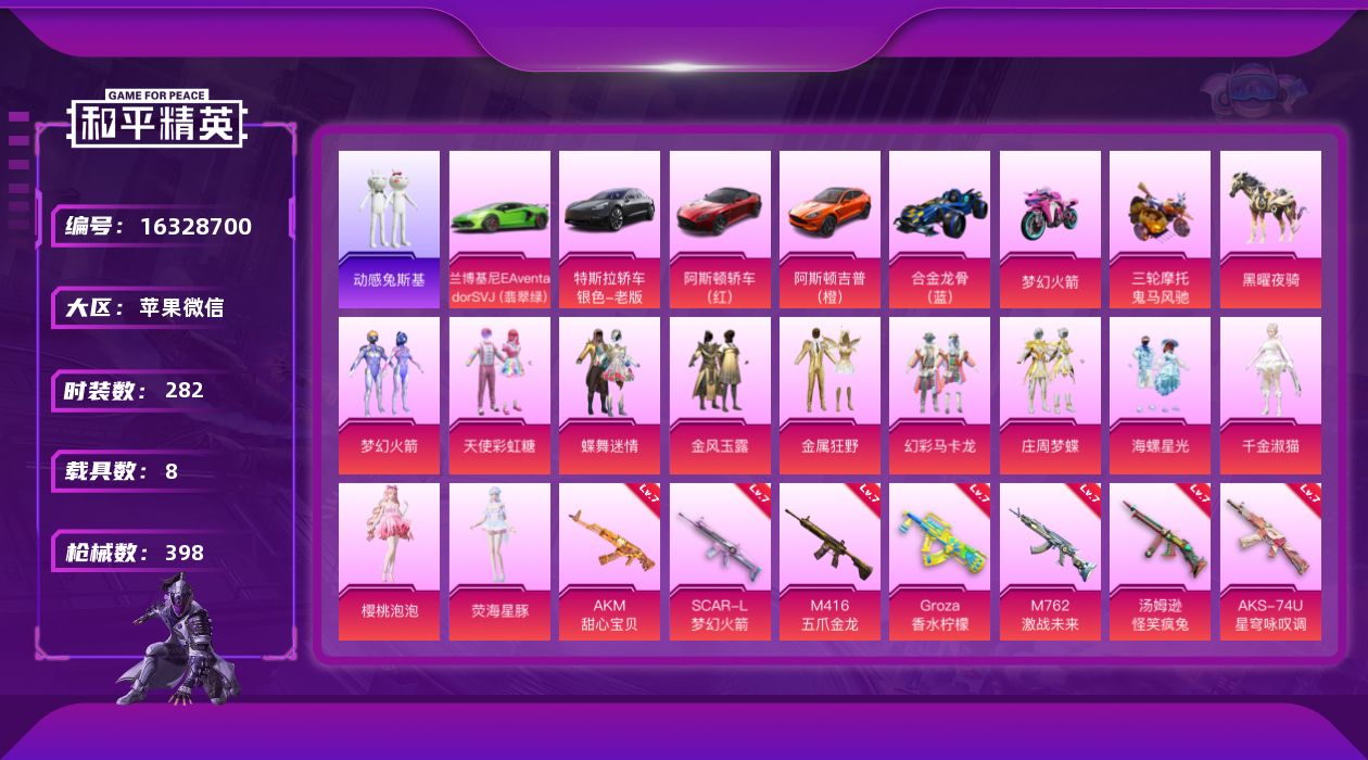[16328700]【特价出售/店主推荐】苹果 微信-11粉装-11特效枪-8载具-7粉色飞行器-142064热力值-32王牌印记-282套装-398枪皮【热门品类】:粉装-梦幻火箭,套装-动感兔斯基人偶服,套装-龟仙人,套装-潮萌小黄鸭,套装-浪漫波比,套装-粉红小猪【粉色套装】:粉装-天使彩虹糖,粉装-蝶舞迷情,粉装-梦幻火箭,粉装-金风玉露,粉装-金属狂野,粉装-幻彩马卡龙,粉装-庄周梦蝶,粉装-海螺星光,角色-千金淑猫,角色-樱桃泡泡,角色-荧海星豚【粉色枪皮等级】:AKM-甜心宝贝(七级),AKM-炫紫旋律(四级),SCAR-L-梦幻火箭(七级),M416-五爪金龙(七级),GROZA-香水柠檬(七级),M762-激战未来(七级),汤姆逊-怪笑疯兔(七级),AKS-74U-星穹咏叹调(七级),Kar98K-巳巳如意(五级),Mk14-樱桃泡泡(七级),DP-28-豹影疾电(五级)【粉色载具】:特斯拉Model 3(冷光银),兰博基尼Aventador SVJ(翡翠绿),阿斯顿马丁DBS(红),阿斯顿马丁DBX(橙),合金龙骨(蓝),双人摩托-梦幻火箭,鬼马风驰,黑曜夜骑【粉色枪皮】:AKM-甜心宝贝,AKM-炫紫旋律,SCAR-L-梦幻火箭,M416-五爪金龙,GROZA-香水柠檬,M762-激战未来,汤姆逊-怪笑疯兔,AKS-74U-星穹咏叹调,Kar98K-巳巳如意,Mk14-樱桃泡泡,DP-28-豹影疾电【粉色飞行器】:梦幻火箭飞行器,炫紫旋律飞行器,庄周梦蝶飞行器,飞天猪飞行器,极意拳锋飞行器,暮色之舞飞行器