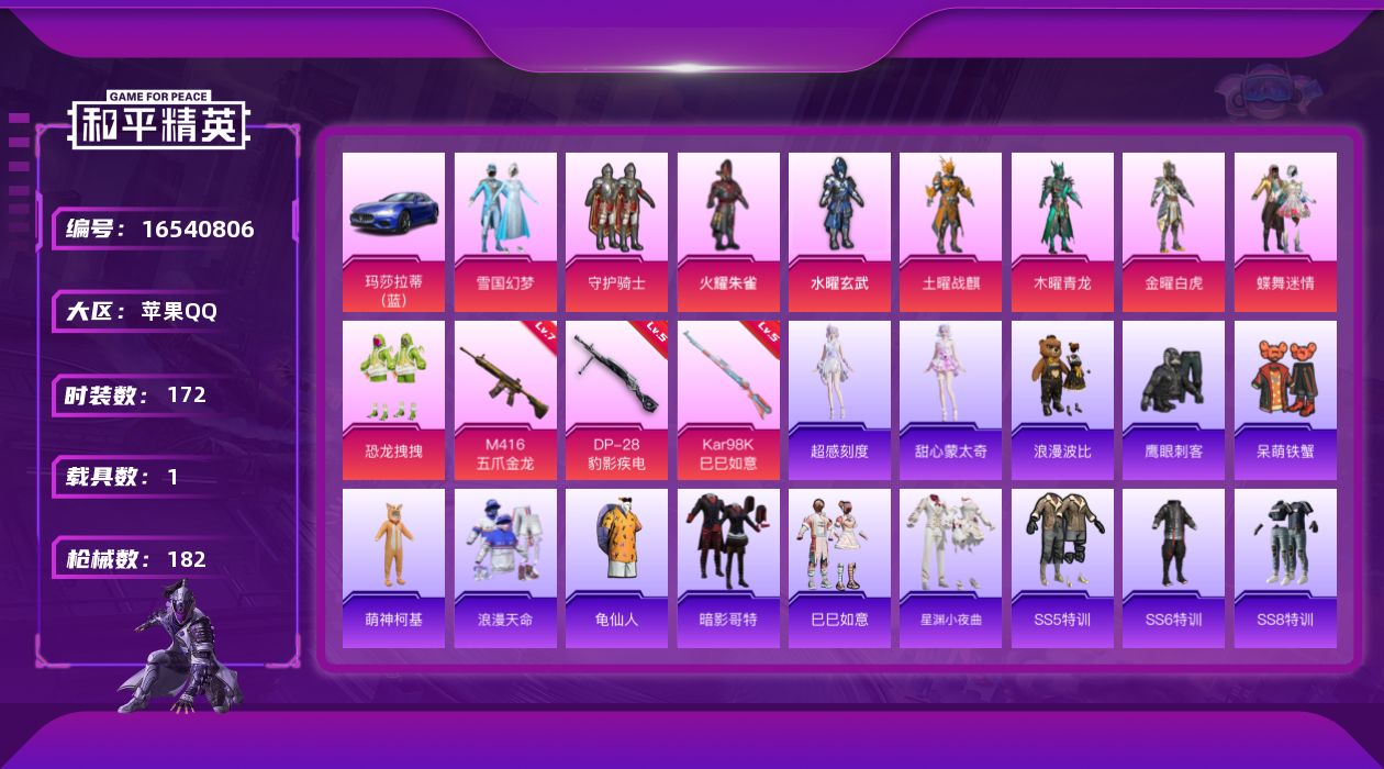 [16540806]【特价出售/店主推荐】 地铁满天赋 苹果 手Q-无敌战神框-9粉装-3特效枪-1载具-3粉色飞行器-63230热力值-11王牌印记-172套装-182枪皮【热门品类】:粉装-雪国幻梦,套装-浪漫天命,套装-龟仙人,套装-暗影哥特,套装-浪漫波比【粉色套装】:粉装-守护骑士,粉装-火曜朱雀,粉装-水曜玄武,粉装-土曜战麒,粉装-木曜青龙,粉装-金曜白虎,粉装-雪国幻梦,粉装-蝶舞迷情,粉装-恐龙拽拽【粉色枪皮等级】:M416-五爪金龙(七级),Kar98K-巳巳如意(五级),DP-28-豹影疾电(五级)【粉色载具】:玛莎拉蒂Ghibli(蓝)【粉色枪皮】:M416-五爪金龙,Kar98K-巳巳如意,DP-28-豹影疾电【粉色飞行器】:春暖花开飞行器
