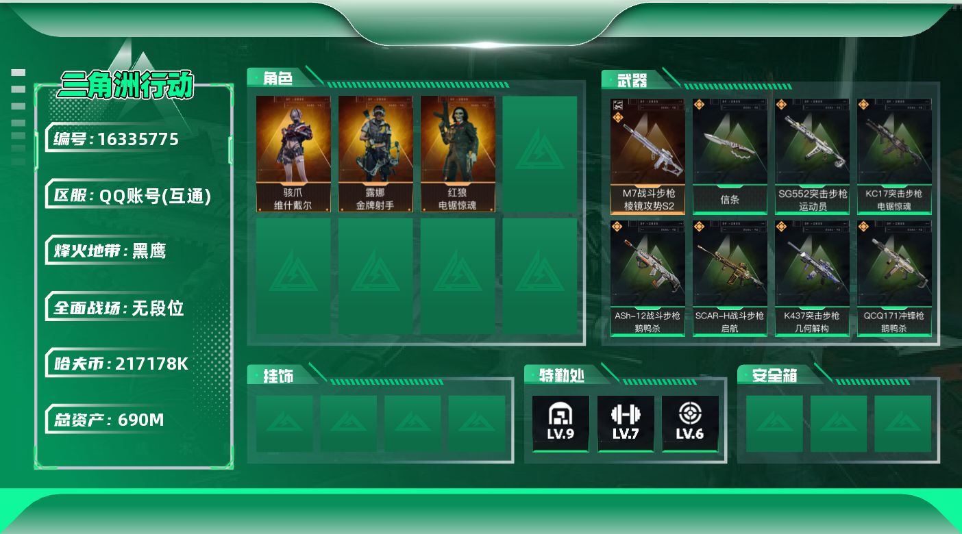 [16335775]1典藏枪皮M7优品炫彩【特价出售/店主推荐】690m总资产-217178k哈伏币-60烽火等级-黑鹰-1战场等级-无军衔 【干员外观】:骇爪-维什戴尔,红狼-电锯惊魂,露娜-金牌射手 【近战皮肤】:近战-信条,近战-黑鹰 【典藏外观】:M7战斗步枪-棱镜攻势S2 【传说外观】:ASh-12战斗步枪-鹅鸭杀,M16A4突击步枪-狩猎时刻,SG552突击步枪-运动员,SCAR-H战斗步枪-启航,G3战斗步枪-狩猎时刻,CAR-15突击步枪-阿米娅,K437突击步枪-几何解构,KC17突击步枪-电锯惊魂,Vector冲锋枪-狩猎时刻,勇士冲锋枪-能天使-午夜邮差,QCQ171冲锋枪-鹅鸭杀,M250通用机枪-几何解构,QJB201轻机枪-鹅鸭杀,SR-9射手步枪-几何解构,R93狙击步枪-维什戴尔 【史诗外观】:QBZ95-1突击步枪-曙光,M7战斗步枪-百步穿杨,G3战斗步枪-流沙送葬,AS Val突击步枪-百步穿杨,腾龙突击步枪-猎鳄行动,MP5冲锋枪-深海恐惧,MP5冲锋枪-战术竞备,MP5冲锋枪-竞技风,Vector冲锋枪-猎鳄行动,Vector冲锋枪-百步穿杨,Vector冲锋枪-异域战争,SR-3M紧凑突击步枪-战术竞备,勇士冲锋枪-深海恐惧,勇士冲锋枪-工业狂潮,M250通用机枪-囚徒,M14射手步枪-工业狂潮,SV-98狙击步枪-林中猎手,SV-98狙击步枪-猎鳄行动,M700狙击步枪-百步穿杨,M700狙击步枪-哈夫克警备,AWM狙击步枪-流沙送葬,沙漠之鹰-曙光 【稀有外观】:SCAR-H战斗步枪-旧梦,SR-3M紧凑突击步枪-巨兽,M4A1突击步枪-繁盛,AKM突击步枪-肃杀,QBZ95-1突击步枪-公平竞技,ASh-12战斗步枪-繁盛,M7战斗步枪-捣蛋鬼,SCAR-H战斗步枪-荣耀列队,腾龙突击步枪-冰天雪地,MP5冲锋枪-哈夫克卫队,P90冲锋枪-黄昏,Vector冲锋枪-先锋,UZI冲锋枪-亚特兰蒂斯,野牛冲锋枪-前沿科技,SMG-45冲锋枪-前沿科技,SMG-45-行动开启,勇士冲锋枪-主宰,勇士冲锋枪-冰天雪地,MP7冲锋枪-钢铁之躯,M1014霰弹枪-幻影结构,M249轻机枪-毛鲁斯之力,Mini-14射手步枪-荣耀列队,SKS射手步枪-弄臣,PSG-1射手步枪-主宰,SV-98狙击步枪-星链科技,SV-98狙击步枪-哈夫克航天,SV