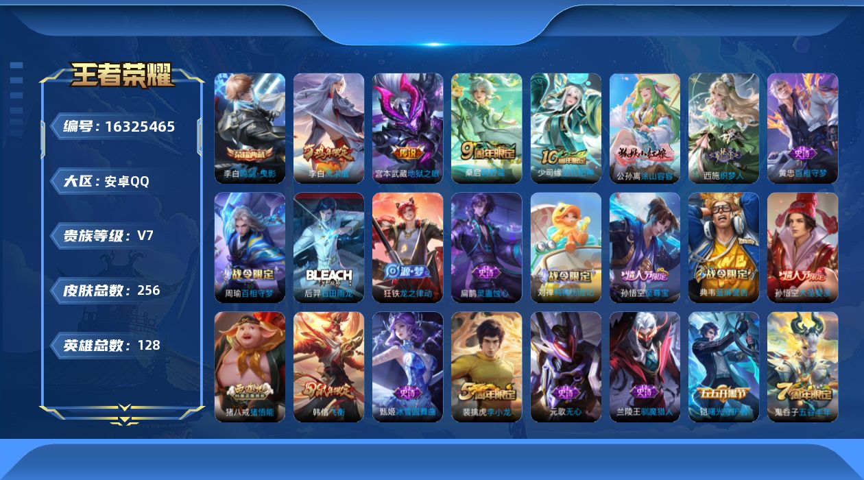 - [11819476]V10 16典藏 2无双 76传说 125英雄 468皮肤 典藏英雄武则天 女号 可修改实名 优质装备:天鹅之梦(小乔典藏),星空梦想(太空人),倪克斯神谕(宇宙婆娘),无限飓风号(高达),活力突击,杀手不太冷,大秦宣太后,鸣剑·曳影,全息碎影(猴子典藏),星域神启(倪克斯贼亮),九霄神辉(木兰典藏),赤影疾锋,银白咏叹调(倪克斯侍卫),幻阙歌(貂蝉典藏),弑枪猎影(韩信典藏),真我赫兹(瑶)(瑶无双),青丘·九尾(妲己无双),神鉴启示录,黄金狮子座,黄金射手座,云鹰飞将(小将军),绛天战甲(鸡嘴战神),黄金白羊座,猫影幻舞,久胜战神,炽阳神光,一念神魔,云霓雀翎,末日机甲-孙尚香(绿蚂蚱),地狱火,仲夏夜之梦(大飞蛾),音你心动-小乔,零号·赤焰,地狱之眼,飞鸢探春,音你心动-周瑜,胖达荣荣,李逍遥,乞巧织情,时之恋人-刘备(电焊工),游龙清影(小青龙),淬星耀世,花朝如约(花篮子),挚爱之约,挚爱花嫁,无双飞将,音你闪耀(rap皮),天秀幻梦,神器·狴犴令,山海·炽霜斩(李信年限),山海·琳琅生(小乔年限),山海·苍雷引(电光曜子),炽翼辉光(娃娃菜牛角包),燃星之曲,画中仙,浮生妄,记忆之芯(机甲兔),青丘·九尾,百相守梦(张飞),追逃游戏(亚瑟),追逃游戏(安琪拉),电玩·雷克斯,鹤羽星尊,灼幽烈阳,妄想实况,妄想奇谈,鹤归松栖(云缨),惊梅引,遇见神鼓,澜逐花归海,艾琳觅芳踪,涂山容容 珍宝阁皮:优雅恋人,女武神 限定皮:至尊宝,凤求凰(白切鸡),凤凰于飞,武陵仙君(小桃花),异界灵契(白毛香),傲雪梅枪,补天,寅虎·展翼(孙膑年限),前尘镜,星穹之声,绯月行,白鹤梁神女,时雨天司(水龙头),飞衡(韩信年限),玄嵩(庄周年限),山海·碧波行(瑶年限),无限倾心-项羽,影龙天霄,遇见飞天,高山流水,诗剑行,无限倾心-虞姬,齐天大圣,匿光决锋者,怒海麟威,降魔,五谷丰年,幽恒(沐浴露),武圣,天狼运算者,游园惊梦,御风骁将(吕布年限),龙胆,烈魂,虎魄,逐梦之音,天狼征服者,奔雷神使(牛魔年限),玄武志(苏烈年限),朱雀志(守约年限),永曜之星,默契交锋-兰陵王,默契交锋-花木兰,真爱至上,纯白花嫁,孙行者,猪悟能,引擎之心,青春决赛季,冰霜恋舞曲,云端筑梦师,乒乒小将,蜜橘之夏,热情桑巴,神奇女侠,美猴王,匿光追影者,女儿国国王,寅虎·瑞焰(虎皮