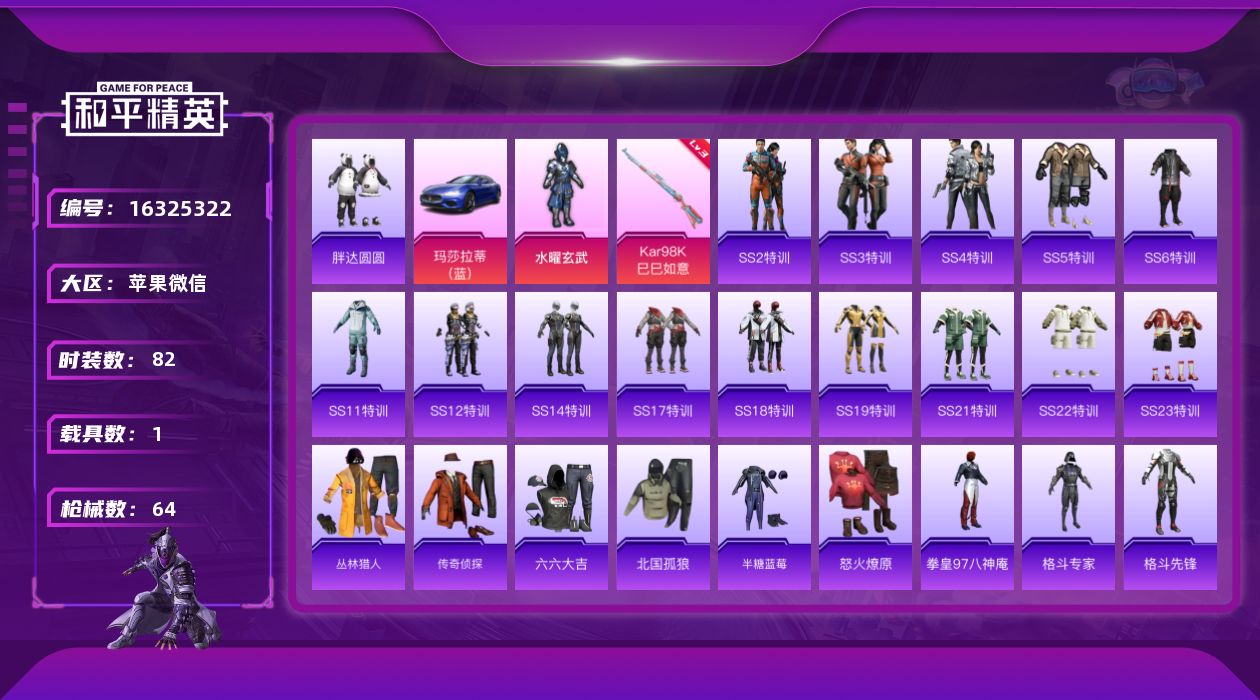 [16325322]【特价出售/店主推荐】苹果 微信-1粉装-1特效枪-1载具-0粉色飞行器-21322热力值-1王牌印记-82套装-64枪皮【热门品类】:套装-胖达圆圆【粉色套装】:粉装-水曜玄武【粉色枪皮等级】:Kar98K-巳巳如意(三级)【粉色载具】:玛莎拉蒂Ghibli(蓝)【粉色枪皮】:Kar98K-巳巳如意
