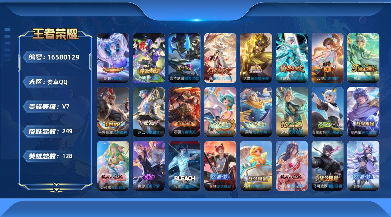 [16580129]【特价出售/店主推荐】,连体火影 16s 930w战力 安卓Q-V7-最强王者段位-128英雄-249皮肤-1典藏皮肤-1珍品传说-7传说-86史诗 【英雄全皮】:刘禅全皮,孙权全皮 【荣耀典藏】:貂蝉幻阙歌 【珍品传说】:孙策时之奇旅 【传说皮肤】:澜愿照九州拓,云缨幻光神枪,桑启鸣野蒿,赵云淬星耀世,诸葛亮时雨天司,干将莫邪久胜战神,达摩黄金狮子座 【限定皮肤】:姜子牙天穹之誓,狄仁杰阴阳师,赵云皇家上将,孙尚香蔷薇恋人,高渐离死亡摇滚,钟无艳超时空战士,扁鹊奇幻香踪,吕布御风骁将,元歌无心,甄姬落雪兰心,马可波罗暗影游猎,马可波罗山海玄木吟,狄仁杰魔术师,狄仁杰万华元夜,达摩沙漠行僧,项羽海滩派对,程咬金演武夺筹,王昭君午后时光,兰陵王金庭之子,李元芳银河之约,李元芳云中旅人,钟馗驱傩正仪,杨戬潮玩骑兵,鬼谷子五谷丰年,诸葛亮时雨天司,梦奇顽趣,沈梦溪大漠名商,裴擒虎李小龙,裴擒虎擒涛扼浪,狂铁电玩高手,云中君纤云弄巧,嫦娥拒霜思,嫦娥暖冬兔眠,鲁班大师探海日志,桑启海盐诗旅,暃星界游侠,阿古朵江河有灵,张良古海寻踪,蒙犽百解令,蒙恬荣光圣徽,高渐离燃音魔法,鬼谷子天穹祈灯,姬小满妄想食味,沈梦溪龙舞盛年,刘邦剑破天穹,程咬金群星魔术团 【年限皮肤】:诸葛亮时雨天司,吕布御风骁将,马可波罗山海玄木吟,澜愿照九州拓 【赛季限定】:狄仁杰万华元夜,程咬金演武夺筹,钟馗驱傩正仪,达摩沙漠行僧,兰陵王金庭之子,沈梦溪大漠名商,李元芳云中旅人,桑启海盐诗旅,裴擒虎擒涛扼浪,鲁班大师探海日志,张良古海寻踪,鬼谷子天穹祈灯,刘邦剑破天穹,姜子牙天穹之誓,东皇太一噬灭天穹,太乙真人谧流熔炉,钟馗虚灵犬护,甄姬逆浪荇歌,亚瑟荣光之誓,梦奇顽趣,蒙恬荣光圣徽,牛魔星界战将,项羽九幽镇关 【战令限定】:李元芳银河之约,马可波罗暗影游猎,狂铁电玩高手,王昭君午后时光,钟无艳超时空战士,甄姬落雪兰心,暃星界游侠,嫦娥暖冬兔眠,扁鹊奇幻香踪,杨戬潮玩骑兵,高渐离燃音魔法,亚连破空之剑,孙悟空神迹守卫,孙膑茶境仙,马超访茗客,刘禅鸭鸭历险记,沈梦溪鸭鸭历险记,莱西奥光弋星穹,明世隐往忆晖光,周瑜线条小狗,小乔线条小狗 【史诗皮肤】:露娜紫霞仙子,赵云皇家上将,赵云未来纪元,貂蝉圣诞恋歌,甄姬冰雪圆舞曲,王昭君偶像歌手,狄仁杰魔术师,廉颇地狱岩魂,宫本武藏鬼剑武藏,孙尚香蔷薇恋人,孙尚香水
